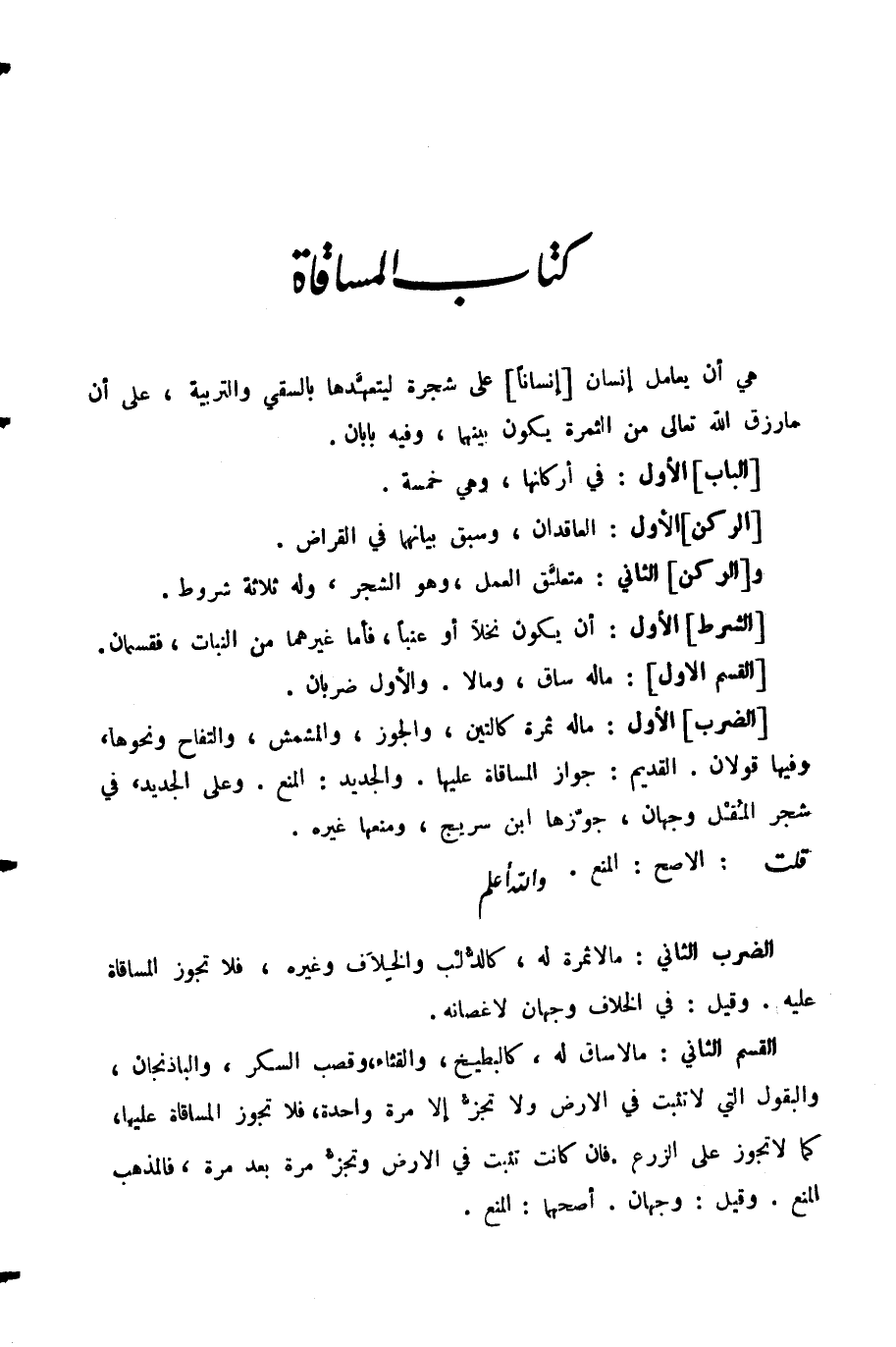 [الضَّرْبُ] الْأَوَّلُ: مَا لَهُ ثَمَرَةٌ كَالتِّينِ وَالْجَوْزِ، وَالْمِشْمِشِ، وَالتُّفَّاحِ وَنَحْوِهَا، وَفِيهَا قَوْلَانِ. الْقَدِيمُ: جَوَازُ الْمُسَاقَاةِ عَلَيْهَا. وَالْجَدِيدُ: الْمَنْعُ. وَعَلَى الْجَدِيدِ، فِي شَجَرِ الْمُقْلِ وَجْهَانِ، جَوَّزَهَا ابْنُ سُرَيْجٍ، وَمَنَعَهَا غَيْرُهُ.