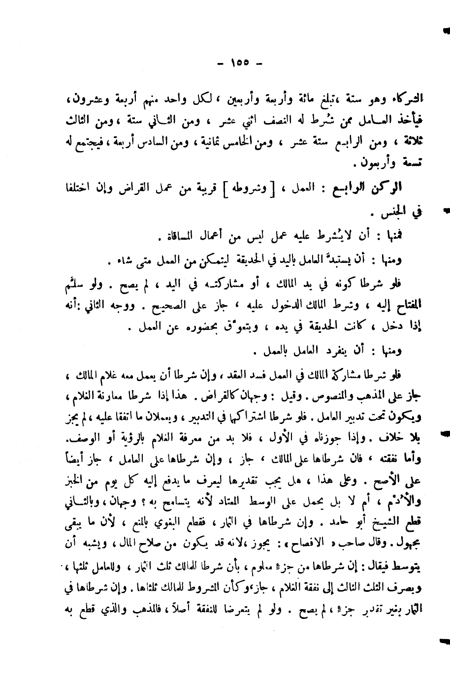 الشُّرَكَاءِ وَهُوَ سِتَّةٌ، تَبْلُغُ مِائَةً وَأَرْبَعَةً وَأَرْبَعِينَ، لِكُلِّ وَاحِدٍ مِنْهُمْ أَرْبَعَةٌ وَعِشْرُونَ، فَيَأْخُذُ الْعَامِلُ مِمَّنْ شَرَطَ لَهُ النِّصْفَ اثْنَيْ عَشَرَ، وَمِنَ الثَّانِي سِتَّةً، وَمِنَ الثَّالِثِ ثَلَاثَةً، وَمِنَ الرَّابِعِ سِتَّةَ عَشَرَ، وَمِنَ الْخَامِسِ ثَمَانِيَةً، وَمِنَ السَّادِسِ أَرْبَعَةً، فَيَجْتَمِعُ لَهُ تِسْعَةٌ وَأَرْبَعُونَ.