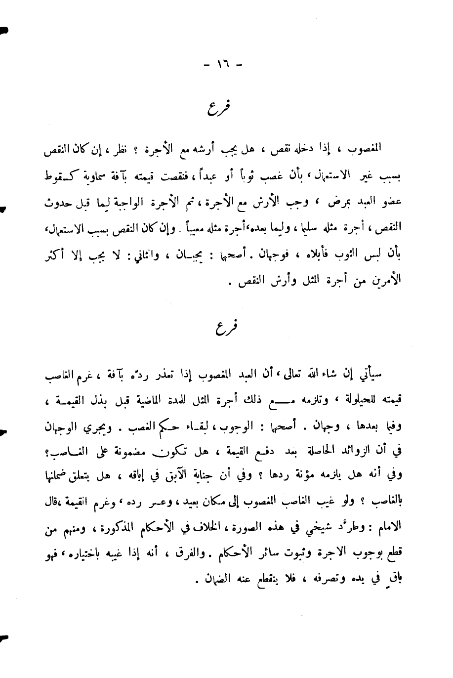 الْمَغْصُوبُ، إِذَا دَخَلَهُ نَقْصٌ، هَلْ يَجِبُ أَرْشُهُ مَعَ الْأُجْرَةِ؟ نُظِرَ، إِنْ كَانَ النَّقْصُ بِسَبَبٍ غَيْرِ الِاسْتِعْمَالِ، بِأَنْ غَصَبَ ثَوْبًا أَوْ عَبْدًا، فَنَقَصَتْ قِيمَتُهُ بِآفَةٍ سَمَاوِيَّةٍ كَسُقُوطِ عُضْوِ الْعَبْدِ بِمَرَضٍ، وَجَبَ الْأَرْشُ مَعَ الْأُجْرَةِ، ثُمَّ الْأُجْرَةُ الْوَاجِبَةُ لِمَا قَبْلَ حُدُوثِ النَّقْصِ أُجْرَةُ مِثْلِهِ سَلِيمًا، وَلِمَا بَعْدَهُ أُجْرَةُ مِثْلِهِ مَعِيبًا. وَإِنْ كَانَ النَّقْصُ بِسَبَبِ الِاسْتِعْمَالِ، بِأَنْ لَبِسَ الثَّوْبَ فَأَبْلَاهُ، فَوَجْهَانِ. أَصَحُّهُمَا: يَجِبَانِ، وَالثَّانِي: لَا يَجِبُ إِلَّا أَكْثَرُ الْأَمْرَيْنِ مِنْ أُجْرَةِ الْمِثْلِ وَأَرْشِ النَّقْصِ.
