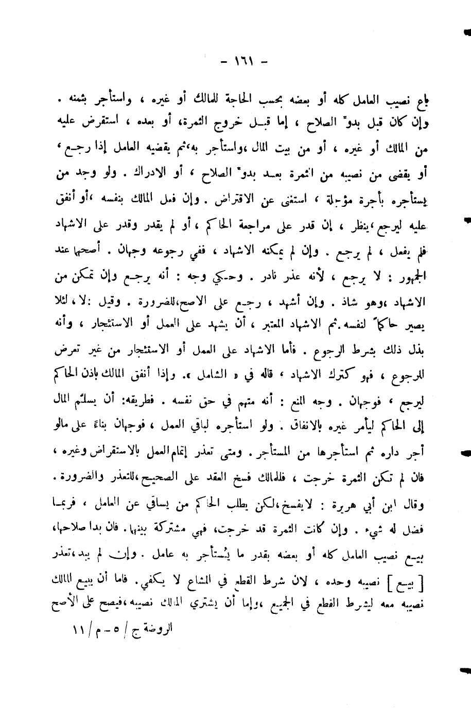ثُمَّ الْإِشْهَادُ الْمُعْتَبَرُ، أَنْ يَشْهَدَ عَلَى الْعَمَلِ أَوِ الِاسْتِئْجَارِ، وَأَنَّهُ بَذَلَ ذَلِكَ بِشَرْطِ الرُّجُوعِ. فَأَمَّا الْإِشْهَادُ عَلَى الْعَمَلِ أَوِ الِاسْتِئْجَارِ مِنْ غَيْرِ تَعَرُّضٍ لِلرُّجُوعِ، فَهُوَ كَتَرْكِ الْإِشْهَادِ، قَالَهُ فِي «الشَّامِلِ» . وَإِذَا أَنْفَقَ الْمَالِكُ بِإِذْنِ الْحَاكِمِ لِيَرْجِعَ، فَوَجْهَانِ. وَجْهُ الْمَنْعِ: أَنَّهُ مُتَّهَمٌ فِي حَقِّ نَفْسِهِ. فَطَرِيقُهُ: أَنْ يُسَلِّمَ الْمَالَ إِلَى الْحَاكِمِ لِيَأْمُرَ غَيْرَهُ بِالْإِنْفَاقِ. وَلَوِ اسْتَأْجَرَهُ لِبَاقِي الْعَمَلِ، فَوَجْهَانِ بِنَاءً عَلَى مَا لَوْ أَجَّرَ دَارَهُ، ثُمَّ اسْتَأْجَرَهَا مِنَ الْمُسْتَأْجِرِ. وَمَتَى تَعَذَّرَ إِتْمَامُ الْعَمَلِ بِالِاسْتِقْرَاضِ وَغَيْرِهِ، فَإِنْ لَمْ تَكُنِ الثَّمَرَةُ خَرَجَتْ، فَلِلْمَالِكِ فَسْخُ الْعَقْدِ عَلَى الصَّحِيحِ، لِلتَّعَذُّرِ وَالضَّرُورَةِ. وَقَالَ ابْنُ أَبِي هُرَيْرَةَ: لَا يَفْسَخُ، لَكِنْ يَطْلُبُ الْحَاكِمُ مَنْ يُسَاقِي عَنِ الْعَامِلِ، فَرُبَّمَا فَضَلَ لَهُ شَيْءٌ.