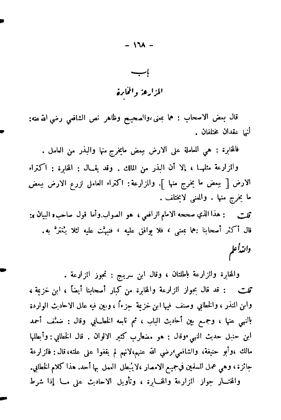 قُلْتُ: قَدْ قَالَ بِجَوَازِ الْمُزَارَعَةِ وَالْمُخَابَرَةِ مِنْ كِبَارِ أَصْحَابِنَا أَيْضًا، ابْنُ خُزَيْمَةَ، وَابْنُ الْمُنْذِرِ، وَالْخَطَّابِيُّ وَصَنَّفَ فِيهَا ابْنُ خُزَيْمَةَ جُزْءًا، وَبَيَّنَ فِيهِ عِلَلَ الْأَحَادِيثِ الْوَارِدَةِ بِالنَّهْيِ عَنْهَا، وَجَمَعَ بَيْنَ أَحَادِيثِ الْبَابِ، ثُمَّ تَابَعَهُ الْخَطَّابِيُّ وَقَالَ: ضَعَّفَ أَحْمَدُ بْنُ حَنْبَلٍ حَدِيثَ النَّهْيِ، وَقَالَ: هُوَ مُضْطَرِبٌ كَثِيرُ الْأَلْوَانِ. قَالَ الْخَطَّابِيُّ: وَأَبْطَلَهَا مَالِكٌ، وَأَبُو حَنِيفَةَ، وَالشَّافِعِيُّ، - رَضِيَ اللَّهُ عَنْهُمْ -، لِأَنَّهُمْ لَمْ يَقِفُوا عَلَى عِلَّتِهِ، قَالَ: فَالْمُزَارَعَةُ جَائِزَةٌ، وَهِيَ عَمَلُ الْمُسْلِمِينَ فِي جَمِيعِ الْأَمْصَارِ، لَا يُبْطِلُ الْعَمَلَ بِهَا أَحَدٌ. هَذَا كَلَامُ الْخَطَّابِيِّ. وَالْمُخْتَارُ جَوَازُ الْمُزَارَعَةِ وَالْمُخَابَرَةِ، وَتَأْوِيلُ الْأَحَادِيثِ عَلَى مَا إِذَا شَرَطَ