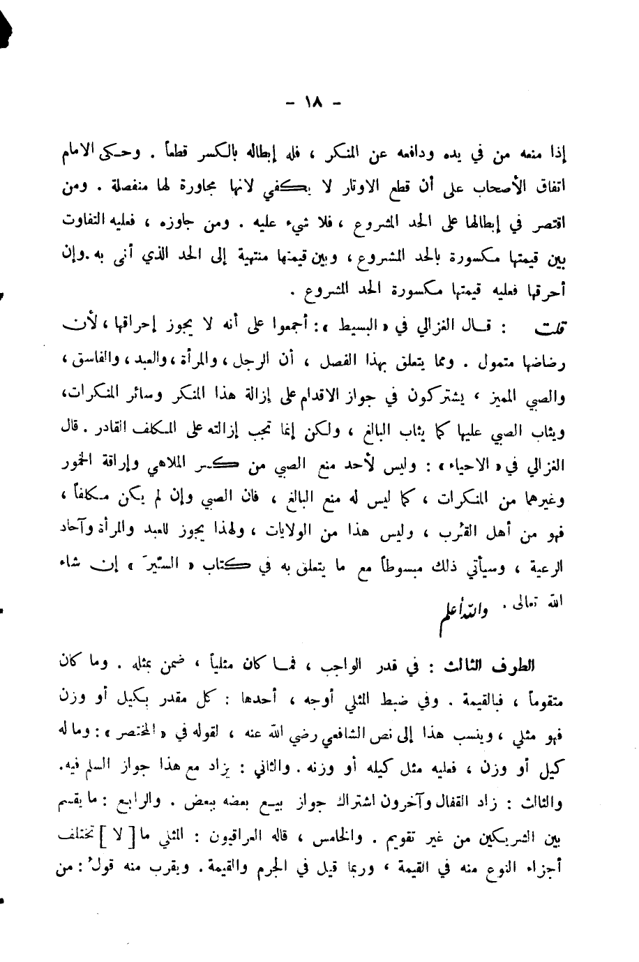 قُلْتُ: قَالَ الْغَزَالِيُّ فِي «الْبَسِيطِ» : أَجْمَعُوا عَلَى أَنَّهُ لَا يَجُوزُ إِحْرَاقُهَا، لِأَنَّ رُضَاضَهَا مُتَمَوَّلٌ. وَمِمَّا يَتَعَلَّقُ بِهَذَا الْفَصْلِ، أَنَّ الرَّجُلَ وَالْمَرْأَةَ وَالْعَبْدَ وَالْفَاسِقَ وَالصَّبِيَّ الْمُمَيِّزَ يَشْتَرِكُونَ فِي جَوَازِ الْإِقْدَامِ عَلَى إِزَالَةِ هَذَا الْمُنْكَرِ وَسَائِرِ الْمُنْكَرَاتِ، وَيُثَابُ الصَّبِيُّ عَلَيْهَا كَمَا يُثَابُ الْبَالِغُ، وَلَكِنْ إِنَّمَا تَجِبُ إِزَالَتُهُ عَلَى الْمُكَلَّفِ الْقَادِرِ. قَالَ الْغَزَالِيُّ فِي «الْإِحْيَاءِ» : وَلَيْسَ لِأَحَدٍ مَنْعُ الصَّبِيِّ مِنْ كَسْرِ الْمَلَاهِي وَإِرَاقَةِ الْخُمُورِ وَغَيْرِهِمَا مِنَ الْمُنْكَرَاتِ، كَمَا لَيْسَ لَهُ مَنْعُ الْبَالِغِ، فَإِنَّ الصَّبِيَّ وَإِنْ لَمْ يَكُنْ مُكَلَّفًا، فَهُوَ مِنْ أَهْلِ الْقُرْبِ، وَلَيْسَ هَذَا مِنَ الْوِلَايَاتِ، وَلِهَذَا يَجُوزُ لِلْعَبْدِ وَالْمَرْأَةِ وَآحَادِ الرَّعِيَّةِ، وَسَيَأْتِي ذَلِكَ مَبْسُوطًا مَعَ مَا يَتَعَلَّقُ بِهِ فِي كِتَابِ «السِّيَرِ» إِنْ شَاءَ اللَّهُ تَعَالَى. وَاللَّهُ أَعْلَمُ.