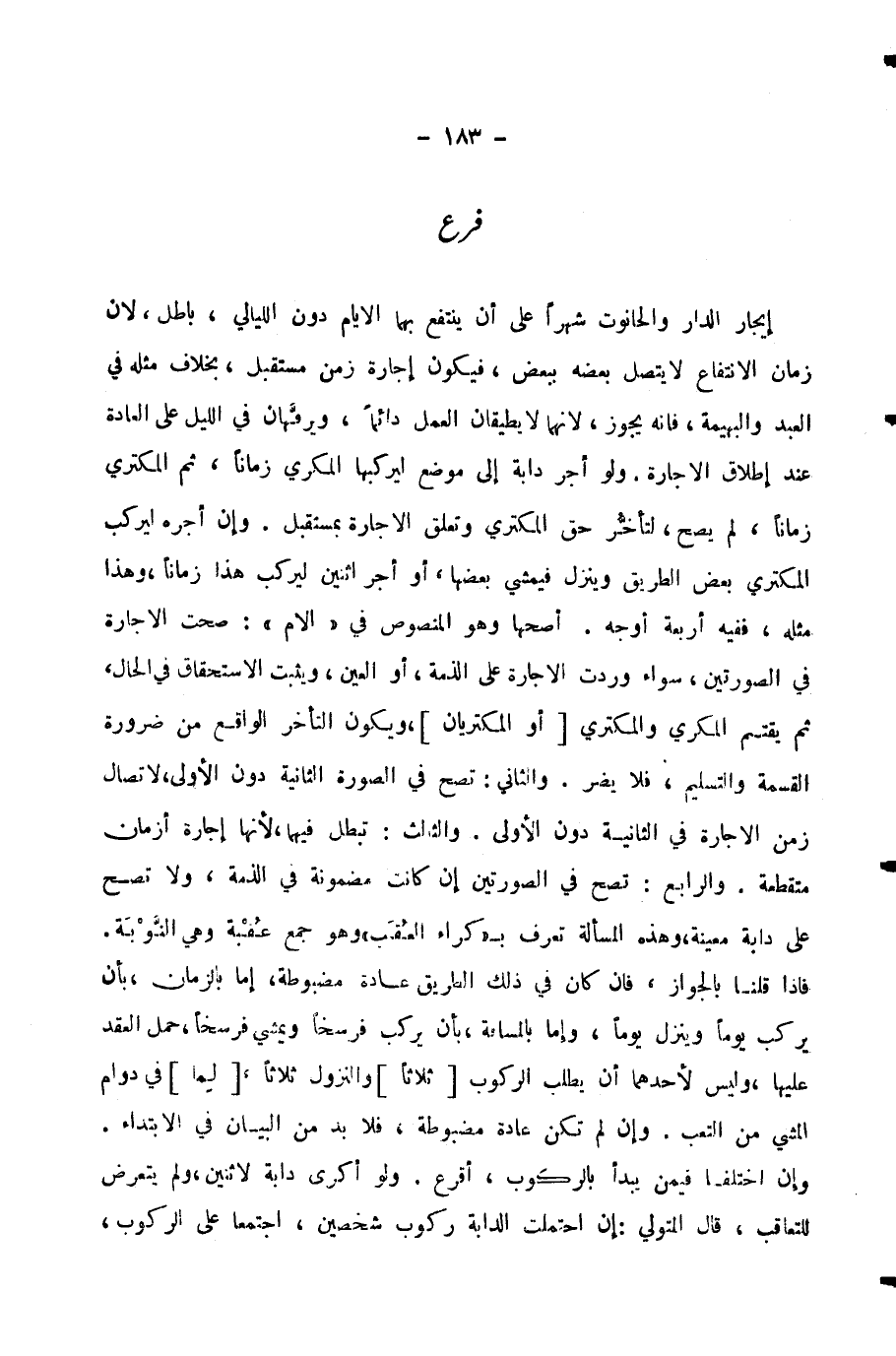 إِيجَارُ الدَّارِ وَالْحَانُوتِ شَهْرًا عَلَى أَنْ يُنْتَفَعَ بِهِمَا الْأَيَّامَ دُونَ اللَّيَالِي، بَاطِلٌ، لِأَنَّ زَمَانَ الِانْتِفَاعِ لَا يَتَّصِلُ بَعْضُهُ بِبَعْضٍ، فَيَكُونُ إِجَارَةُ زَمَنٍ مُسْتَقْبَلٍ، بِخِلَافِ مِثْلِهِ فِي الْعَبْدِ وَالْبَهِيمَةِ، فَإِنَّهُ يَجُوزُ، لِأَنَّهُمَا لَا يُطِيقَانِ الْعَمَلَ دَائِمًا، وَيُرَفَّهَانِ فِي اللَّيْلِ عَلَى الْعَادَةِ عِنْدَ إِطْلَاقِ الْإِجَارَةِ. وَلَوْ أَجَّرَ دَابَّةً إِلَى مَوْضِعٍ لِيَرْكَبَهَا الْمُكْرِي زَمَانًا، ثُمَّ الْمُكْتَرِي زَمَانًا، لَمْ يَصِحَّ، لِتَأَخُّرِ حَقِّ الْمُكْتَرِي وَتَعَلُّقِ الْإِجَارَةِ بِمُسْتَقْبَلٍ. وَإِنْ أَجَّرَهُ لِيَرْكَبَ الْمُكْتَرِي بَعْضَ الطَّرِيقِ وَيَنْزِلَ فَيَمْشِيَ بَعْضَهَا، أَوْ أَجَّرَ اثْنَيْنِ لِيَرْكَبَ هَذَا زَمَانًا، وَهَذَا مِثْلَهُ، فَفِيهِ أَرْبَعَةُ أَوْجُهٍ. أَصَحُّهَا وَهُوَ الْمَنْصُوصُ فِي «الْأُمِّ» : صَحَّتِ الْإِجَارَةُ فِي الصُّورَتَيْنِ، سَوَاءٌ وَرَدَتِ الْإِجَارَةُ عَلَى الذِّمَّةِ، أَوِ الْعَيْنِ، وَيَثْبُتُ الِاسْتِحْقَاقُ فِي الْحَالِ، ثُمَّ يَقْتَسِمُ الْمُكْرِي وَالْمُكْتَرِي [أَوِ الْمُكْتَرِيَانِ] ، وَيَكُونُ التَّأَخُّرُ الْوَاقِعُ مِنْ ضَرُورَةِ الْقِسْمَةِ وَالتَّسْلِيمِ، فَلَا يَضُرُّ.