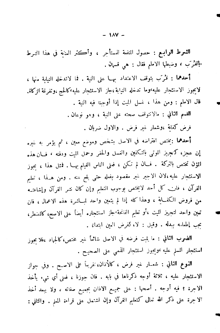 الشَّرْطُ الرَّابِعُ: حُصُولُ الْمَنْفَعَةِ لِلْمُسْتَأْجِرِ، وَأَكْثَرُ الْعِنَايَةِ فِي هَذَا الشَّرْطِ بِالْقُرَبِ، وَضَبَطَهَا الْإِمَامُ فَقَالَ: هِيَ قِسْمَانِ. أَحَدُهُمَا: قُرَبٌ يَتَوَقَّفُ الِاعْتِدَادُ بِهَا عَلَى النِّيَّةِ. فَمَا لَا تَدْخُلُهُ النِّيَابَةُ مِنْهَا، لَا يَجُوزُ الِاسْتِئْجَارُ عَلَيْهِ، وَمَا تَدْخُلُهُ النِّيَابَةُ، جَازَ الِاسْتِئْجَارُ عَلَيْهِ، كَالْحَجِّ، وَتَفْرِقَةِ الزَّكَاةِ. قَالَ الْإِمَامُ: وَمِنْ هَذَا، غُسْلُ الْمَيِّتِ إِذَا أَوْجَبْنَا فِيهِ النِّيَّةَ. الْقِسْمُ الثَّانِي: مَا لَا تَتَوَقَّفُ صِحَّتُهُ عَلَى النِّيَّةِ، وَهُوَ نَوْعَانِ. فَرْضُ كِفَايَةٍ، وَشِعَارُ غَيْرِ فَرْضٍ. وَالْأَوَّلُ ضَرْبَانِ. أَحَدُهُمَا: يَخْتَصُّ افْتِرَاضُهُ فِي الْأَصْلِ بِشَخْصٍ وَمَوْضِعٍ مُعَيَّنٍ، ثُمَّ يُؤْمَرُ بِهِ غَيْرُهُ إِنْ عَجَزَ، كَتَجْهِيزِ الْمَوْتَى بِالتَّكْفِينِ وَالْغُسْلِ وَالْحَفْرِ وَحَمْلِ الْمَيِّتِ وَدَفْنِهِ، فَإِنَّ هَذِهِ الْمُؤَنَ تَخْتَصُّ بِالتَّرِكَةِ. فَإِنْ لَمْ تَكُنْ، فَعَلَى النَّاسِ الْقِيَامُ بِهَا. فَمِثْلُ هَذَا يَجُوزُ الِاسْتِئْجَارُ عَلَيْهِ، لِأَنَّ الْأَجِيرَ غَيْرُ مَقْصُودٍ بِفِعْلِهِ حَتَّى يَقَعَ عَنْهُ. وَمِنْ هَذَا، تَعْلِيمُ الْقُرْآنِ، فَإِنَّ كُلَّ أَحَدٍ لَا يَخْتَصُّ بِوُجُوبِ التَّعْلِيمِ وَإِنْ كَانَ نَشْرُ الْقُرْآنِ وَإِشَاعَتُهُ مِنْ فُرُوضِ الْكِفَايَةِ، وَهَذَا كُلُّهُ إِذَا لَمْ يَتَعَيَّنْ وَاحِدٌ لِمُبَاشَرَةِ هَذِهِ الْأَعْمَالِ، فَإِنْ تَعَيَّنَ وَاحِدٌ لِتَجْهِيزِ الْمَيِّتِ، أَوْ تَعْلِيمِ الْفَاتِحَةِ، جَازَ اسْتِئْجَارُهُ أَيْضًا عَلَى الْأَصَحِّ، كَالْمُضْطَرِّ، يَجِبُ إِطْعَامُهُ بِبَدَلِهِ. وَقِيلَ: لَا، كَفَرْضِ الْعَيْنِ ابْتِدَاءً. الضَّرْبُ الثَّانِي: مَا يَثْبُتُ فَرْضُهُ فِي الْأَصْلِ شَائِعًا غَيْرَ مُخْتَصٍّ، كَالْجِهَادِ، فَلَا يَجُوزُ اسْتِئْجَارُ الْمُسْلِمِ عَلَيْهِ، وَيَجُوزُ اسْتِئْجَارُ الذِّمِّيِّ عَلَى الصَّحِيحِ.
