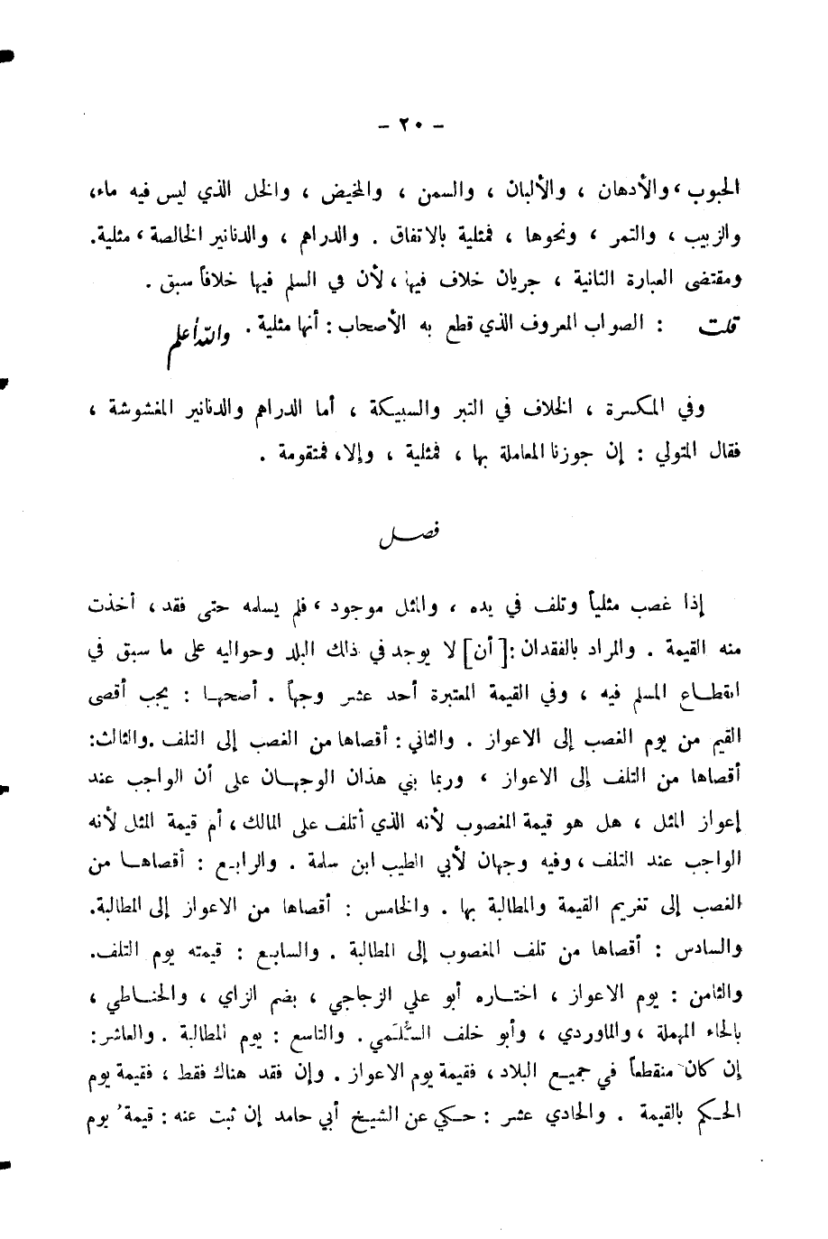 إِذَا غَصَبَ مِثْلِيًّا وَتَلِفَ فِي يَدِهِ، وَالْمِثْلُ مَوْجُودٌ، فَلَمْ يُسَلِّمْهُ حَتَّى فُقِدَ أُخِذَتْ مِنْهُ الْقِيمَةُ. وَالْمُرَادُ بِالْفِقْدَانِ: [أَنْ] لَا يُوجَدَ فِي ذَلِكَ الْبَلَدِ وَحَوَالَيْهِ عَلَى مَا سَبَقَ فِي انْقِطَاعِ الْمُسْلَمِ فِيهِ، وَفِي الْقِيمَةِ الْمُعْتَبَرَةِ أَحَدَ عَشَرَ وَجْهًا. أَصَحُّهَا: يَجِبُ أَقْصَى الْقِيَمِ مِنْ يَوْمِ الْغَصْبِ إِلَى الْإِعْوَازِ. وَالثَّانِي: أَقْصَاهَا مِنَ الْغَصْبِ إِلَى التَّلَفِ. وَالثَّالِثُ: أَقْصَاهَا مِنَ التَّلَفِ إِلَى الْإِعْوَازِ، وَرُبَّمَا بُنِيَ هَذَانِ الْوَجْهَانِ عَلَى أَنَّ الْوَاجِبَ عِنْدَ إِعْوَازِ الْمِثْلِ هَلْ هُوَ قِيمَةُ الْمَغْصُوبِ لِأَنَّهُ الَّذِي أُتْلِفَ عَلَى الْمَالِكِ أَمْ قِيمَةُ الْمِثْلِ لِأَنَّهُ الْوَاجِبُ عِنْدَ التَّلَفِ، وَفِيهِ وَجْهَانِ لِأَبِي الطَّيِّبِ ابْنِ سَلَمَةَ. وَالرَّابِعُ: أَقْصَاهَا مِنَ الْغَصْبِ إِلَى تَغْرِيمِ الْقِيمَةِ وَالْمُطَالَبَةِ بِهَا. وَالْخَامِسُ: أَقْصَاهَا مِنَ الْإِعْوَازِ إِلَى الْمُطَالَبَةِ. وَالسَّادِسُ: أَقْصَاهَا مِنْ تَلَفِ الْمَغْصُوبِ إِلَى الْمُطَالَبَةِ. وَالسَّابِعُ: قِيمَتُهُ يَوْمَ التَّلَفِ. وَالثَّامِنُ: يَوْمَ الْإِعْوَازِ، اخْتَارَهُ أَبُو عَلِيٍّ الزُّجَاجِيُّ، بِضَمِّ الزَّايِ، وَالْحَنَّاطِيُّ، بِالْحَاءِ الْمُهْمَلَةِ، وَالْمَاوَرْدِيُّ، وَأَبُو خَلَفٍ السُّلَمِيُّ. وَالتَّاسِعُ: يَوْمَ الْمُطَالَبَةِ. وَالْعَاشِرُ: إِنْ كَانَ مُنْقَطِعًا فِي جَمِيعِ الْبِلَادِ فَقِيمَةُ يَوْمِ الْإِعْوَازِ. وَإِنْ فُقِدَ هُنَاكَ فَقَطْ، فَقِيمَةُ يَوْمِ الْحُكْمِ بِالْقِيمَةِ. وَالْحَادِيَ عَشَرَ: حُكِيَ عَنِ الشَّيْخِ أَبِي حَامِدٍ إِنْ ثَبَتَ عَنْهُ: قِيمَةُ يَوْمِ