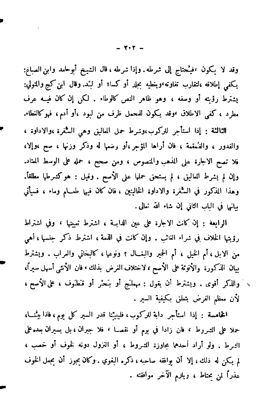 الرَّابِعَةُ: إِنْ كَانَتِ الْإِجَارَةُ عَلَى عَيْنِ الدَّابَّةِ، اشْتَرَطَ تَعْيِينَهَا، وَفِي اشْتِرَاطِ رُؤْيَتِهَا الْخِلَافُ فِي شِرَاءِ الْغَائِبِ. وَإِنْ كَانَتْ فِي الذِّمَّةِ، اشْتَرَطَ ذِكْرَ جِنْسِهَا، أَهِيَ مِنَ الْإِبِلِ، أَمِ الْخَيْلِ، أَمِ الْحَمِيرِ وَالْبِغَالِ؟ وَنَوْعُهَا، كَالْبَخَاتِيِّ وَالْعِرَابِ.