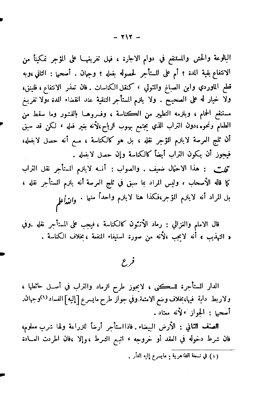 قَالَ الْإِمَامُ وَالْغَزَالِيُّ: رَمَادُ الْأَتُّونِ كَالْكُنَاسَةِ، فَيَجِبُ عَلَى الْمُسْتَأْجِرِ نَقْلُهُ. وَفِي «التَّهْذِيبِ» أَنَّهُ لَا يَجِبُ، لِأَنَّهُ مِنْ صُورَةِ اسْتِيفَاءِ الْمَنْفَعَةِ، بِخِلَافِ الْكُنَاسَةِ.