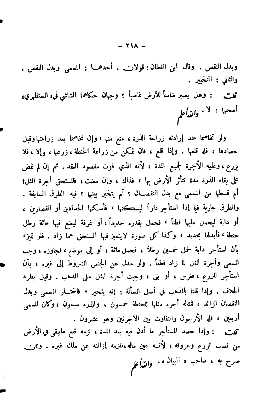 قُلْتُ: وَإِذَا حَصَدَ الْمُسْتَأْجِرُ مَا أَذِنَ فِيهِ بَعْدَ الْمُدَّةِ، لَزِمَهُ قَلْعُ مَا يَبْقَى فِي الْأَرْضِ مِنْ قَصَبِ الزَّرْعِ وَعُرُوقِهِ، لِأَنَّهُ عَيْنُ مَالِهِ، فَلَزِمَهُ إِزَالَتُهُ عَنْ مِلْكِ غَيْرِهِ. وَمِمَّنْ صَرَّحَ بِهِ، صَاحِبُ الْبَيَانِ. وَاللَّهُ أَعْلَمُ.