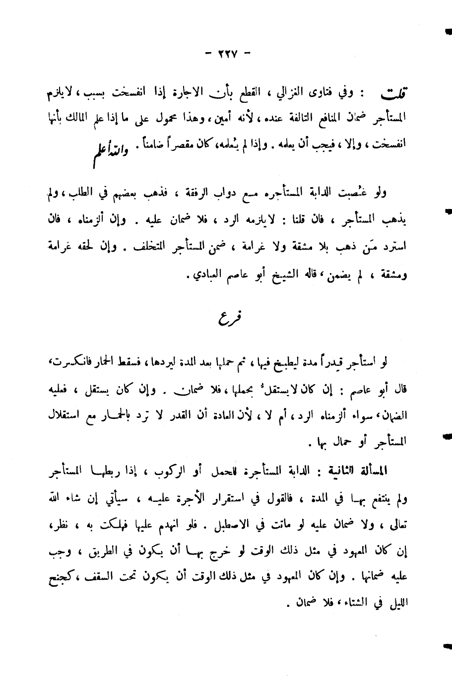 قُلْتُ: وَفِي فَتَاوَى الْغَزَالِيِّ، الْقَطْعُ بِأَنَّ الْإِجَارَةَ إِذَا انْفَسَخَتْ بِسَبَبٍ، لَا يَلْزَمُ الْمُسْتَأْجِرُ ضَمَانَ الْمَنَافِعِ التَّالِفَةِ عِنْدَهُ، لِأَنَّهُ أَمِينٌ، وَهَذَا مَحْمُولٌ عَلَى مَا إِذَا عَلِمَ الْمَالِكُ بِأَنَّهَا انْفَسَخَتْ، وَإِلَّا، فَيَجِبُ أَنْ يُعْلِمَهُ. وَإِذَا لَمْ يُعْلِمْهُ، كَانَ مُقَصِّرًا ضَامِنًا. وَاللَّهُ أَعْلَمُ.