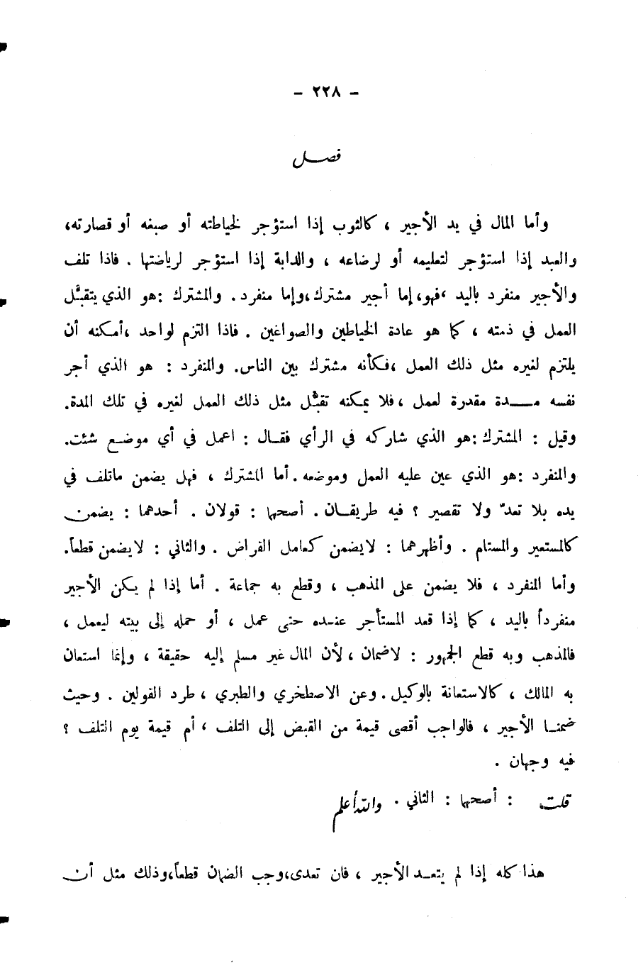 وَأَمَّا الْمَالُ فِي يَدِ الْأَجِيرِ، كَالثَّوْبِ إِذَا اسْتُؤْجِرَ لِخِيَاطَتِهِ أَوْ صَبْغِهِ أَوْ قِصَارَتِهِ، وَالْعَبْدِ إِذَا اسْتُؤْجِرَ لِتَعْلِيمِهِ أَوْ لِرِضَاعِهِ، وَالدَّابَّةِ إِذَا اسْتُؤْجِرَ لِرِيَاضَتِهَا. فَإِذَا تَلِفَ وَالْأَجِيرُ مُنْفَرِدٌ بِالْيَدِ، فَهُوَ، إِمَّا أَجِيرٌ مُشْتَرَكٌ، وَإِمَّا مُنْفَرِدٌ. وَالْمُشْتَرَكُ: هُوَ الَّذِي يَتَقَبَّلُ الْعَمَلَ فِي ذِمَّتِهِ، كَمَا هُوَ عَادَةُ الْخَيَّاطِينَ وَالصَّوَّاغِينَ. فَإِذَا الْتَزَمَ لِوَاحِدٍ، أَمْكَنَهُ أَنْ يَلْتَزِمَ لِغَيْرِهِ مِثْلَ ذَلِكَ الْعَمَلِ، فَكَأَنَّهُ مُشْتَرِكٌ بَيْنَ النَّاسِ. وَالْمُنْفَرِدُ: هُوَ الَّذِي أَجَّرَ نَفْسَهُ مُدَّةً مُقَدَّرَةً لِعَمَلٍ، فَلَا يُمْكِنُهُ تَقَبُّلُ مِثْلَ ذَلِكَ الْعَمَلِ لِغَيْرِهِ فِي تِلْكَ الْمُدَّةِ.