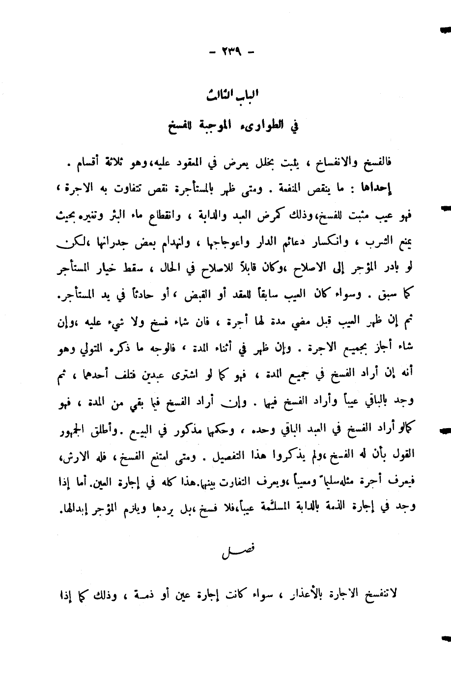فَالْفَسْخُ وَالِانْفِسَاخُ، يَثْبُتُ بِخَلَلٍ يَعْرِضُ فِي الْمَعْقُودِ عَلَيْهِ، وَهُوَ ثَلَاثَةُ أَقْسَامٍ. إِحْدَاهَا: مَا يُنْقِصُ الْمَنْفَعَةَ. وَمَتَى ظَهَرَ بِالْمُسْتَأْجَرَةِ نَقْصٌ تَتَفَاوَتُ بِهِ الْأُجْرَةُ، فَهُوَ عَيْبٌ مُثْبِتٌ لِلْفَسْخِ، وَذَلِكَ كَمَرَضِ الْعَبْدِ وَالدَّابَّةِ، وَانْقِطَاعِ مَاءِ الْبِئْرِ وَتَغَيُّرِهِ بِحَيْثُ يَمْنَعُ الشُّرْبَ، وَانْكِسَارِ دَعَائِمِ الدَّارِ وَاعْوِجَاجِهَا، وَانْهِدَامِ بَعْضِ جُدْرَانِهَا، لَكِنْ لَوْ بَادَرَ الْمُؤَجِّرُ إِلَى الْإِصْلَاحِ، وَكَانَ قَابِلًا لِلْإِصْلَاحِ فِي الْحَالِ، سَقَطَ خِيَارُ الْمُسْتَأْجِرِ كَمَا سَبَقَ.