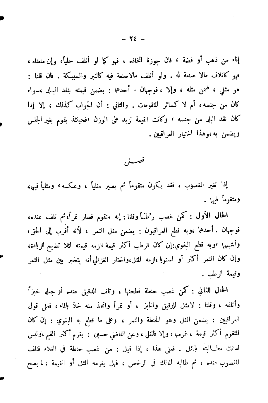 الْحَالُ الثَّانِي: كَمَنْ غَصَبَ حِنْطَةً فَطَحَنَهَا، وَتَلِفَ الدَّقِيقُ عِنْدَهُ أَوْ جَعَلَهُ خُبْزًا وَأَتْلَفَهُ، وَقُلْنَا: لَا مِثْلَ لِلدَّقِيقِ وَالْخُبْزِ، أَوْ تَمْرًا وَاتَّخَذَ مِنْهُ خَلًّا بِالْمَاءِ، فَعَلَى قَوْلِ الْعِرَاقِيِّينَ: يَضْمَنُ الْمِثْلَ وَهُوَ الْحِنْطَةُ وَالتَّمْرُ، وَعَلَى مَا قَطَعَ بِهِ الْبَغَوِيُّ: إِنْ كَانَ الْمُتَقَوَّمُ أَكْثَرَ قِيمَةً غَرِمَهَا، وَإِلَّا فَالْمِثْلُ، وَعَنِ الْقَاضِي حُسَيْنٍ: يَغْرَمُ أَكْثَرَ الْقِيَمِ، وَلَيْسَ لِلْمَالِكِ مُطَالَبَتُهُ بِالْمِثْلِ. فَعَلَى هَذَا إِذَا قِيلَ: مَنْ غَصَبَ حِنْطَةً فِي الْغَلَاءِ فَتَلِفَ الْمَغْصُوبُ عِنْدَهُ، ثُمَّ طَالَبَهُ الْمَالِكُ فِي الرُّخْصِ، فَهَلْ يُغَرِّمُهُ الْمِثْلَ أَوِ الْقِيمَةَ، لَمْ يَصِحَّ