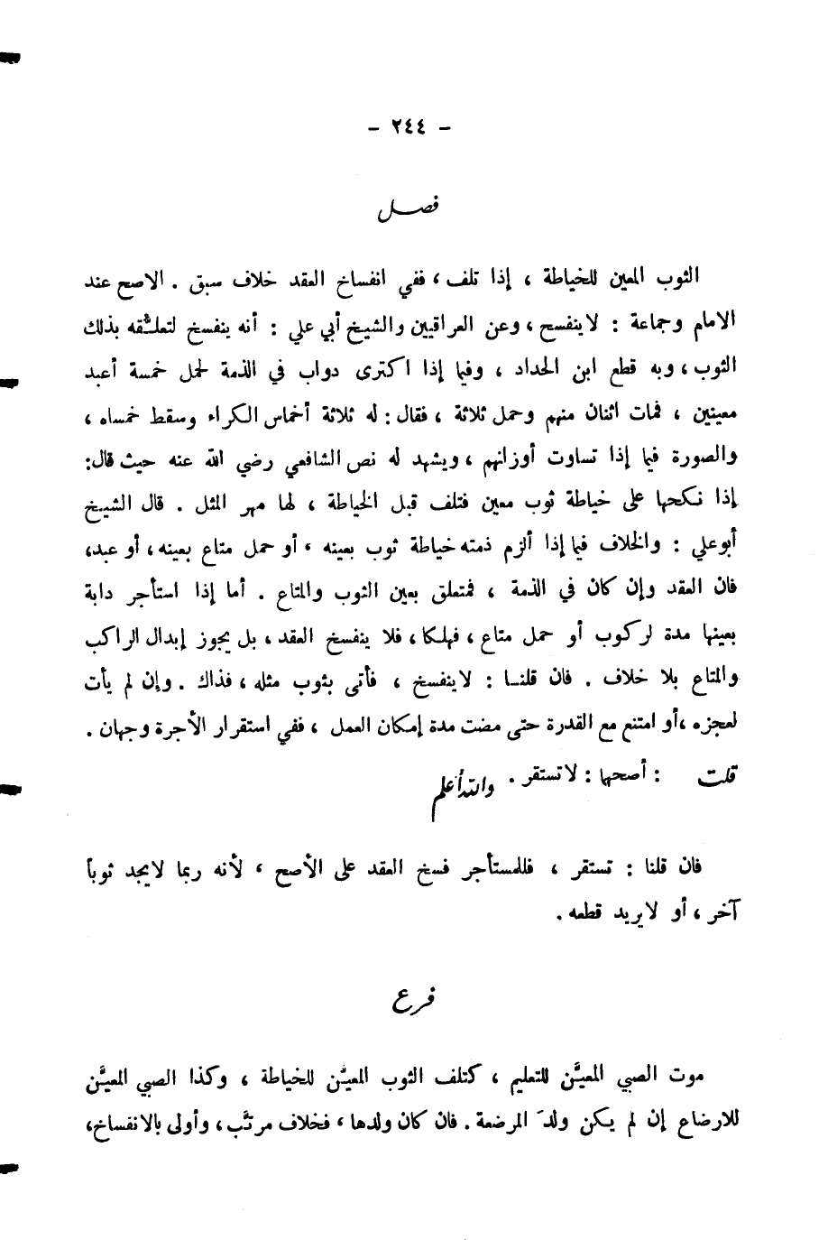 قُلْتُ: أَصَحُّهُمَا: لَا تَسْتَقِرُّ. وَاللَّهُ أَعْلَمُ. فَإِنْ قُلْنَا: تَسْتَقِرُّ، فَلِلْمُسْتَأْجِرِ فَسْخُ الْعَقْدِ عَلَى الْأَصَحِّ، لِأَنَّهُ رُبَّمَا لَا يَجِدُ ثَوْبًا آخَرَ، أَوْ لَا يُرِيدُ قَطْعَهُ.
