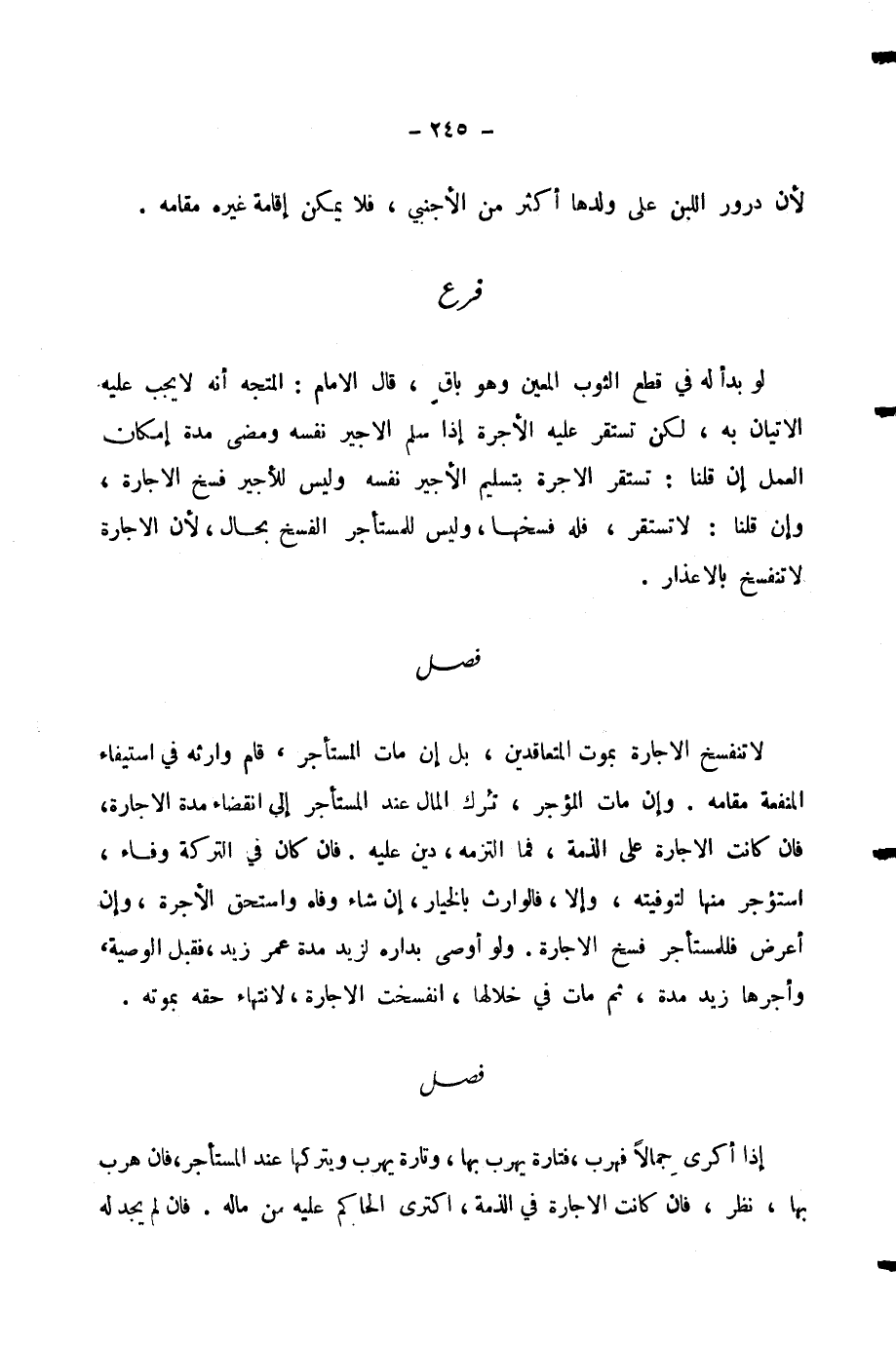 لَا تَنْفَسِخُ الْإِجَارَةُ بِمَوْتِ الْمُتَعَاقِدَيْنِ، بَلْ إِنْ مَاتَ الْمُسْتَأْجِرُ، قَامَ وَارِثُهُ فِي اسْتِيفَاءِ الْمَنْفَعَةِ مَقَامَهُ. وَإِنْ مَاتَ الْمُؤَجِّرُ، تَرَكَ الْمَالَ عِنْدَ الْمُسْتَأْجِرِ إِلَى انْقِضَاءِ مُدَّةِ الْإِجَارَةِ، فَإِنْ كَانَتِ الْإِجَارَةُ عَلَى الذِّمَّةِ، فَمَا الْتَزَمَهُ، دَيْنٌ عَلَيْهِ. فَإِنْ كَانَ فِي التَّرِكَةِ وَفَاءٌ، اسْتُؤْجِرَ مِنْهَا لَتَوْفِيَتِهِ، وَإِلَّا، فَالْوَارِثُ بِالْخِيَارِ، إِنْ شَاءَ وَفَّاهُ وَاسْتَحَقَّ الْأُجْرَةَ، وَإِنْ أَعْرَضَ فَلِلْمُسْتَأْجِرِ فَسْخُ الْإِجَارَةِ. وَلَوْ أَوْصَى بِدَارِهِ لِزَيْدٍ مُدَّةَ عُمْرِ زَيْدٍ، فَقَبِلَ الْوَصِيَّةَ، وَأَجَّرَهَا زَيْدٌ مُدَّةً، ثُمَّ مَاتَ فِي خِلَالِهَا، انْفَسَخَتِ الْإِجَارَةُ، لِانْتِهَاءِ حَقِّهِ بِمَوْتِهِ.