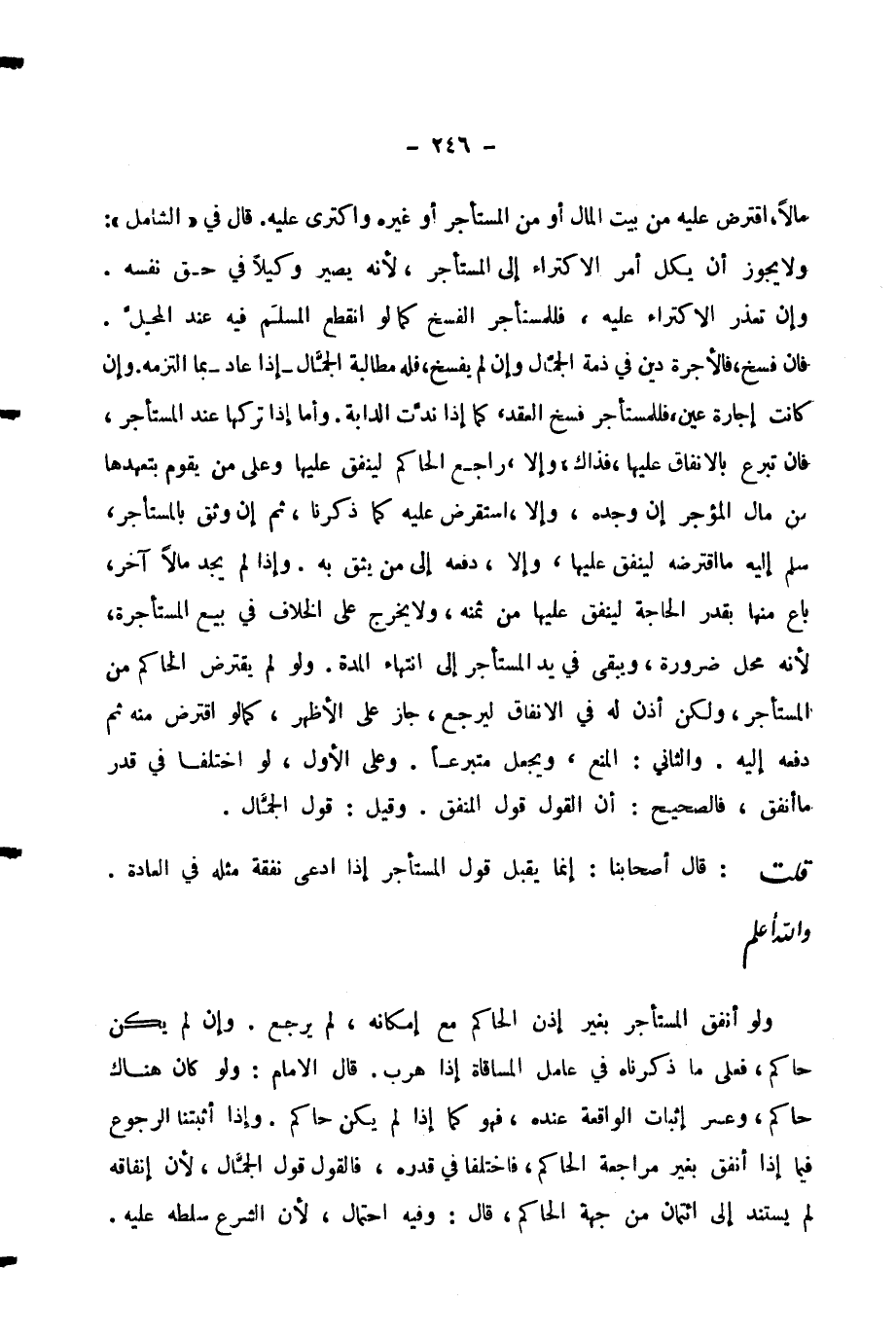 مَالًا، اقْتَرَضَ عَلَيْهِ مِنْ بَيْتِ الْمَالِ أَوْ مِنَ الْمُسْتَأْجِرِ أَوْ غَيْرِهِ وَاكْتَرَى عَلَيْهِ. قَالَ فِي «الشَّامِلِ» : وَلَا يَجُوزُ أَنْ يَكِلَ أَمْرَ الِاكْتِرَاءِ إِلَى الْمُسْتَأْجِرِ، لِأَنَّهُ يَصِيرُ وَكِيلًا فِي حَقِّ نَفْسِهِ. وَإِنْ تَعَذَّرَ الِاكْتِرَاءُ عَلَيْهِ، فَلِلْمُسْتَأْجِرِ الْفَسْخُ كَمَا لَوِ انْقَطَعَ الْمُسَلَّمُ فِيهِ عِنْدَ الْمَحِلِّ. فَإِنْ فَسَخَ، فَالْأُجْرَةُ دَيْنٌ فِي ذِمَّةِ الْجَمَّالِ وَإِنْ لَمْ يَفْسَخْ، فَلَهُ مُطَالَبَةُ الْجَمَّالِ - إِذَا عَادَ - بِمَا الْتَزَمَهُ. وَإِنْ كَانَتْ إِجَارَةُ عَيْنٍ، فَلِلْمُسْتَأْجِرِ فَسْخُ الْعَقْدِ، كَمَا إِذَا نَدَّتِ الدَّابَّةُ. وَأَمَّا إِذَا تَرَكَهَا عِنْدَ الْمُسْتَأْجِرِ، فَإِنْ تَبَرَّعَ بِالْإِنْفَاقِ عَلَيْهَا، فَذَاكَ، وَإِلَّا، رَاجَعَ الْحَاكِمَ لِيُنْفِقَ عَلَيْهَا وَعَلَى مَنْ يَقُومُ بِتَعَهُّدِهَا مِنْ مَالِ الْمُؤَجِّرِ إِنْ وَجَدَهُ، وَإِلَّا، اسْتَقْرَضَ عَلَيْهِ كَمَا ذَكَرْنَا، ثُمَّ إِنْ وَثِقَ بِالْمُسْتَأْجِرِ، سَلَّمَ إِلَيْهِ مَا اقْتَرَضَهُ لِيُنْفِقَ عَلَيْهَا، وَإِلَّا، دَفَعَهُ إِلَى مَنْ يَثِقُ بِهِ.