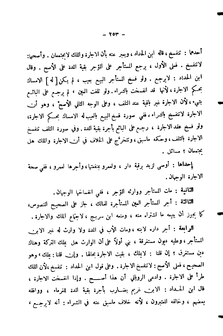 إِحْدَاهَا: أَوْصَى لِزَيْدٍ بِرُقْبَةِ دَارٍ، وَلِعَمْرٍو بِمَنْفَعَتِهَا، وَأَجَّرَهَا لِعَمْرٍو، فَفِي صِحَّةِ الْإِجَارَةِ الْوَجْهَانِ. الثَّانِيَةُ: مَاتَ الْمُسْتَأْجِرُ وَوَارِثُهُ، الْمُؤَجِّرُ فَفِي انْفِسَاخِهَا الْوَجْهَانِ. الثَّالِثَةُ: أَجَّرَ الْمُسْتَأْجِرُ الْعَيْنَ الْمُسْتَأْجَرَةَ لِلْمَالِكِ، جَازَ عَلَى الصَّحِيحِ الْمَنْصُوصِ، كَمَا يَجُوزُ أَنْ يَبِيعَهُ مَا اشْتَرَاهُ مِنْهُ، وَمَنَعَهُ ابْنُ سُرَيْجٍ، لِاجْتِمَاعِ الْمِلْكِ وَالْإِجَارَةِ. الرَّابِعَةُ: أَجَّرَ دَارَهُ لِابْنِهِ، وَمَاتَ الْأَبُ فِي الْمُدَّةِ وَلَا وَارِثَ لَهُ غَيْرُ الِابْنِ الْمُسْتَأْجِرِ، وَعَلَيْهِ دُيُونٌ مُسْتَغْرِقَةٌ، بُنِيَ أَوَّلًا عَلَى أَنَّ الْوَارِثَ هَلْ يَمْلِكُ التَّرِكَةَ وَهُنَاكَ دَيْنٌ مُسْتَغْرِقٌ؟ إِنْ قُلْنَا: لَا يَمْلِكُ، بَقِيَتِ الْإِجَارَةُ بِحَالِهَا. وَإِنْ قُلْنَا: يَمْلِكُ، وَهُوَ الصَّحِيحُ، فَعَلَى الْأَصَحِّ: لَا تَنْفَسِخُ الْإِجَارَةُ. وَعَلَى قَوْلِ ابْنِ الْحَدَّادِ: تَنْفَسِخُ، لِأَنَّ الْمِلْكَ طَرَأَ عَلَى الْإِجَارَةِ. وَادَّعَى الرُّوْيَانِيُّ أَنَّ هَذَا أَصَحُّ.
