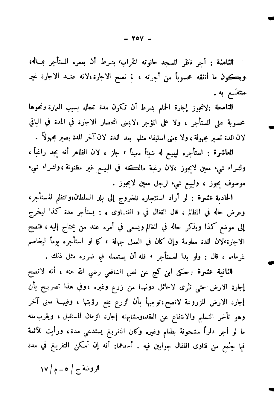 الثَّامِنَةُ: أَجَّرَ نَاظِرُ الْمَسْجِدِ حَانُوتَهُ الْخَرَابَ، بِشَرْطِ أَنْ يُعَمِّرَهُ الْمُسْتَأْجِرُ بِمَالِهِ، وَيَكُونَ مَا أَنْفَقَهُ مَحْسُوبًا مِنْ أُجْرَتِهِ، لَمْ تَصِحَّ الْإِجَارَةُ، لِأَنَّهُ عِنْدَ الْإِجَارَةِ غَيْرُ مُنْتَفِعٍ بِهِ. التَّاسِعَةُ: لَا تَجُوزُ إِجَارَةُ الْحَمَّامِ بِشَرْطِ أَنْ تَكُونَ مُدَّةُ تَعَطُّلِهِ بِسَبَبِ الْعِمَارَةِ وَنَحْوِهَا مَحْسُوبَةً عَلَى الْمُسْتَأْجِرِ، وَلَا عَلَى الْمُؤَجِّرِ، لَا بِمَعْنَى انْحِصَارِ الْإِجَارَةِ فِي الْمُدَّةِ فِي الْبَاقِي لِأَنَّ الْمُدَّةَ تَصِيرُ مَجْهُولَةً، وَلَا بِمَعْنَى اسْتِيفَاءِ مِثْلِهَا بَعْدَ الْمُدَّةِ لِأَنَّ آخِرَ الْمُدَّةِ يَصِيرُ مَجْهُولًا. الْعَاشِرَةُ: اسْتَأْجَرَهُ لِيَبِيعَ لَهُ شَيْئًا مُعَيَّنًا، جَازَ، لِأَنَّ الظَّاهِرَ أَنَّهُ يَجِدُ رَاغِبًا، وَلِشِرَاءِ شَيْءٍ مُعَيَّنٍ لَا يَجُوزُ، لِأَنَّ رَغْبَةَ مَالِكِهِ فِي الْبَيْعِ غَيْرُ مَظْنُونَةٍ، وَلِشِرَاءِ شَيْءٍ مَوْصُوفٍ يَجُوزُ، وَلِبَيْعِ شَيْءٍ مُعَيَّنٍ لَا يَجُوزُ. الْحَادِيَةَ عَشْرَةَ: لَوْ أَرَادَ اسْتِئْجَارَهُ لِلْخُرُوجِ إِلَى بَلَدِ السُّلْطَانِ، وَالتَّظَلُّمِ لِلْمُسْتَأْجِرِ، وَعَرْضِ حَالِهِ فِي الْمَظَالِمِ، قَالَ الْقَفَّالُ فِي «الْفَتَاوَى» : يَسْتَأْجِرُ مُدَّةَ كَذَا لِيَخْرُجَ إِلَى مَوْضِعِ كَذَا وَيَذْكُرَ حَالَهُ فِي الْمَظَالِمِ وَيَسْعَى فِي أَمْرِهِ عِنْدَ مَنْ يَحْتَاجُ إِلَيْهِ، فَتَصِحَّ الْإِجَارَةُ، لِأَنَّ الْمُدَّةَ مَعْلُومَةٌ وَإِنْ كَانَ فِي الْعَمَلِ جَهَالَةٌ، كَمَا لَوِ اسْتَأْجَرَهُ يَوْمًا لِيُخَاصِمَ غُرَمَاءَهُ، قَالَ: وَلَوْ بَدَا لِلْمُسْتَأْجِرِ، فَلَهُ أَنْ يَسْتَعْمِلَهُ فِيمَا ضَرَرُهُ مِثْلُ ذَلِكَ.