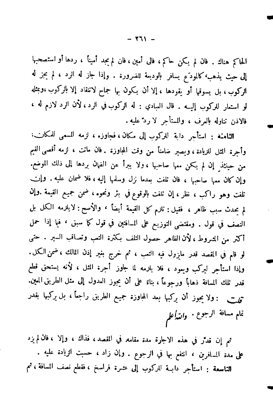 ثُمَّ إِنْ قَدَّرَ فِي هَذِهِ الْإِجَارَةِ مُدَّةَ مَقَامِهِ فِي الْمَقْصِدِ، فَذَاكَ، وَإِلَّا، فَإِنْ لَمْ يَزِدْ عَلَى مُدَّةِ الْمُسَافِرِينَ، انْتَفَعَ بِهَا فِي الرُّجُوعِ. وَإِنْ زَادَ، حُسِبَتِ الزِّيَادَةُ عَلَيْهِ. التَّاسِعَةُ: اسْتَأْجَرَ دَابَّةً لِلرُّكُوبِ إِلَى عَشَرَةِ فَرَاسِخَ، فَقَطَعَ نِصْفَ الْمَسَافَةِ، ثُمَّ