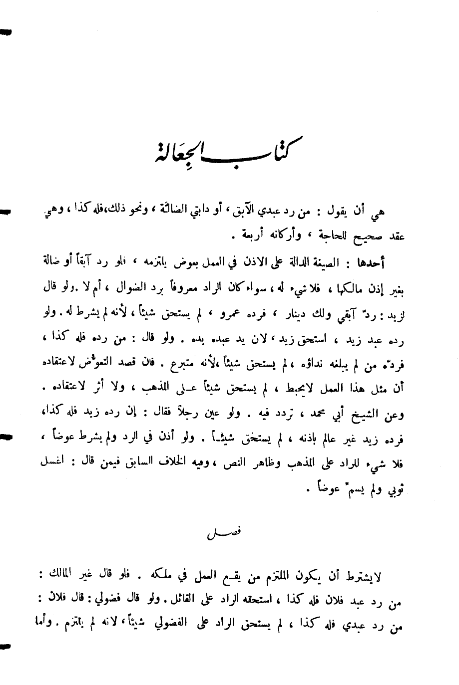 هِيَ أَنْ يَقُولَ: مَنْ رَدَّ عَبْدِي الْآبِقَ، أَوْ دَابَّتِي الضَّالَّةَ، وَنَحْوَ ذَلِكَ، فَلَهُ كَذَا، وَهِيَ عَقْدٌ صَحِيحٌ لِلْحَاجَةِ، وَأَرْكَانُهُ أَرْبَعَةٌ. أَحَدُهَا: الصِّيغَةُ الدَّالَّةُ عَلَى الْإِذْنِ فِي الْعَمَلِ بِعِوَضٍ يَلْتَزِمُهُ، فَلَوْ رَدَّ آبِقًا أَوْ ضَالَّةً بِغَيْرِ إِذْنِ مَالِكِهَا، فَلَا شَيْءَ لَهُ، سَوَاءٌ كَانَ الرَّادُّ مَعْرُوفًا بِرَدِّ الضَّوَالِّ، أَمْ لَا.