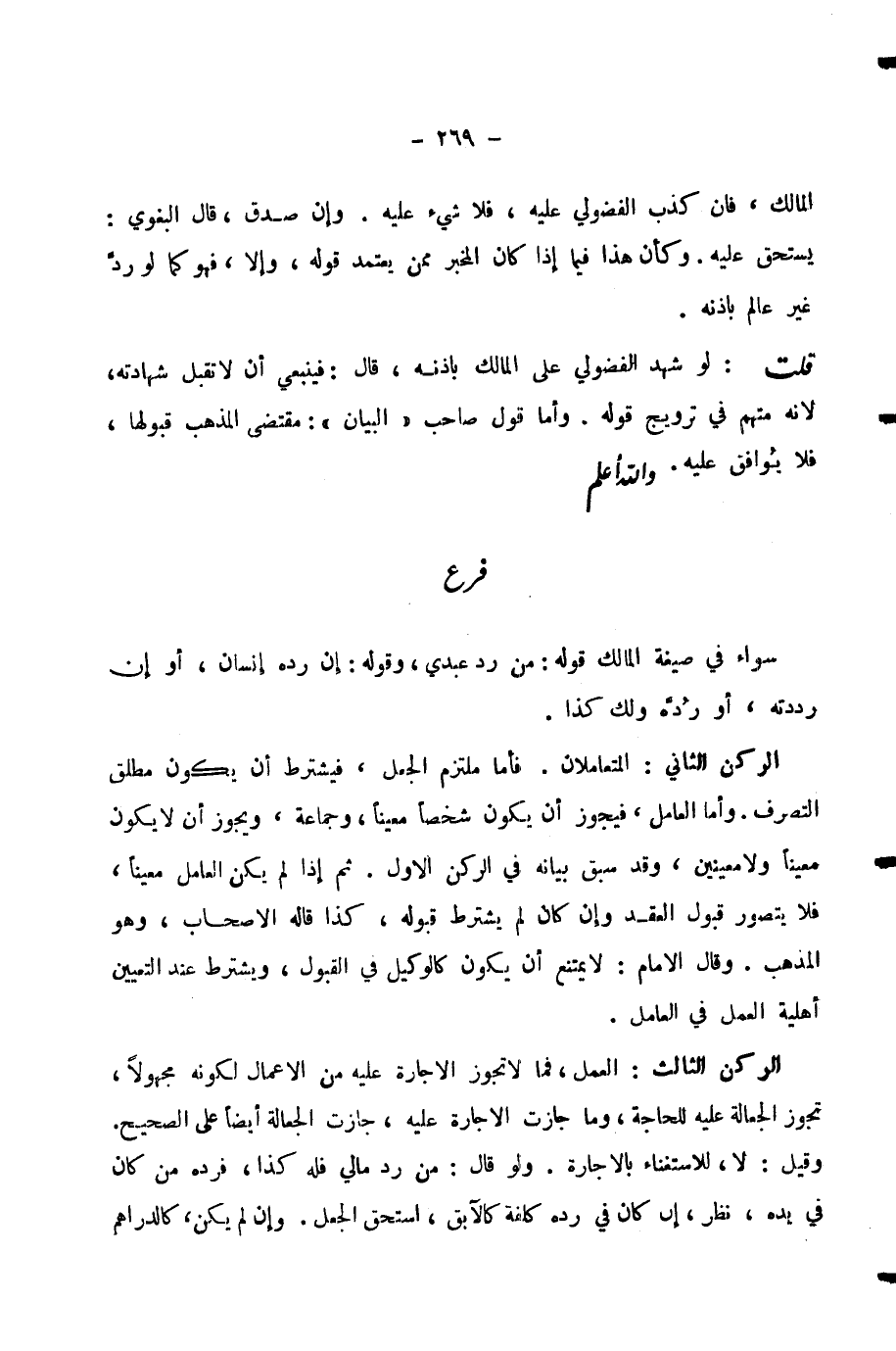 سَوَاءٌ فِي صِيغَةِ الْمَالِكِ قَوْلُهُ: مَنْ رَدَّ عَبْدِي، وَقَوْلُهُ: إِنْ رَدَّهُ إِنْسَانٌ، أَوْ إِنْ رَدَدْتَهُ، أَوْ رَدَّهُ وَلَكَ كَذَا. الرُّكْنُ الثَّانِي: الْمُتَعَامِلَانِ. فَأَمَّا مُلْتَزِمُ الْجَعْلِ، فَيُشْتَرَطُ أَنْ يَكُونَ مُطْلَقَ التَّصَرُّفِ. وَأَمَّا الْعَامِلُ، فَيَجُوزُ أَنْ يَكُونَ شَخْصًا مُعَيَّنًا، وَجَمَاعَةً، وَيَجُوزُ أَنْ لَا يَكُونَ مُعَيَّنًا وَلَا مُعَيَّنِينَ، وَقَدْ سَبَقَ بَيَانُهُ فِي الرُّكْنِ الْأَوَّلِ. ثُمَّ إِذَا لَمْ يَكُنِ الْعَامِلُ مُعَيَّنًا، فَلَا يُتَصَوَّرُ قَبُولُ الْعَقْدِ وَإِنْ كَانَ لَمْ يُشْتَرَطْ قَبُولُهُ، كَذَا قَالَهُ الْأَصْحَابُ، وَهُوَ الْمَذْهَبُ. وَقَالَ الْإِمَامُ: لَا يَمْتَنِعُ أَنْ يَكُونَ كَالْوَكِيلِ فِي الْقَبُولِ، وَيُشْتَرَطُ عِنْدَ التَّعْيِينِ أَهْلِيَّةُ الْعَمَلِ فِي الْعَامِلِ.