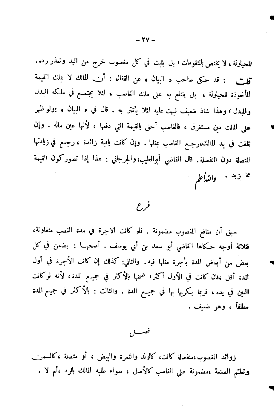 زَوَائِدُ الْمَغْصُوبِ مُنْفَصِلَةً كَانَتْ كَالْوَلَدِ وَالثَّمَرَةِ وَالْبَيْضِ أَوْ مُتَّصِلَةً كَالسِّمَنِ وَتَعَلُّمِ الصَّنْعَةِ مَضْمُونَةٌ عَلَى الْغَاصِبِ كَالْأَصْلِ، سَوَاءٌ طَلَبَهُ الْمَالِكُ بِالرَّدِّ أَمْ لَا.
