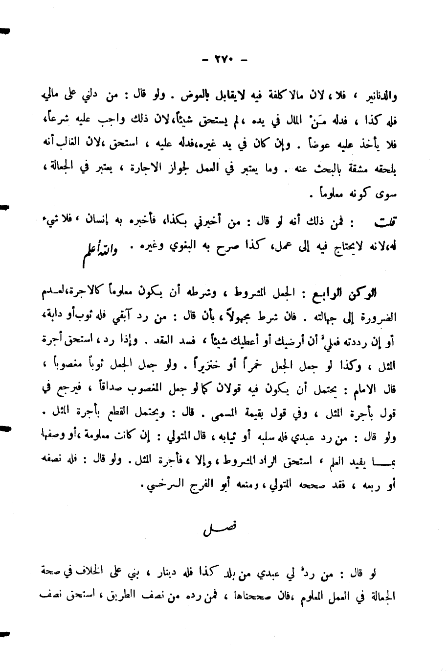 الرُّكْنُ الرَّابِعُ: الْجَعْلُ الْمَشْرُوطُ، وَشَرْطُهُ أَنْ يَكُونَ مَعْلُومًا كَالْأُجْرَةِ، لِعَدَمِ الضَّرُورَةِ إِلَى جَهَالَتِهِ. فَإِنْ شَرَطَ مَجْهُولًا، بِأَنْ قَالَ: مَنْ رَدَّ آبِقِي فَلَهُ ثَوْبٌ أَوْ دَابَّةٌ، أَوْ إِنْ رَدَدْتَهُ فَعَلَيَّ أَنْ أُرْضِيَكَ أَوْ أُعْطِيَكَ شَيْئًا، فَسَدَ الْعَقْدُ. وَإِذَا رَدَّ، اسْتَحَقَّ أُجْرَةَ الْمِثْلِ، وَكَذَا لَوْ جُعِلَ الْجَعْلُ خَمْرًا أَوْ خِنْزِيرًا. وَلَوْ جُعِلَ الْجَعْلُ ثَوْبًا مَغْصُوبًا، قَالَ الْإِمَامُ: يُحْتَمَلُ أَنْ يَكُونَ فِيهِ قَوْلَانِ كَمَا لَوْ جُعِلَ الْمَغْصُوبُ صَدَاقًا، فَيَرْجِعَ فِي قَوْلٍ بِأُجْرَةِ الْمِثْلِ، وَفِي قَوْلٍ بِقِيمَةِ الْمُسَمَّى. قَالَ: وَيُحْتَمَلُ الْقَطْعُ بِأُجْرَةِ الْمِثْلِ. وَلَوْ قَالَ: مَنْ رَدَّ عَبْدِي فَلَهُ سَلْبُهُ أَوْ ثِيَابُهُ، قَالَ الْمُتَوَلِّي: إِنْ كَانَتْ مَعْلُومَةً، أَوْ وَصَفَهَا بِمَا يُفِيدُ الْعِلْمَ، اسْتَحَقَّ الرَّادُّ الْمَشْرُوطَ، وَإِلَّا، فَأُجْرَةُ الْمِثْلِ. وَلَوْ قَالَ: فَلَهُ نِصْفُهُ أَوْ رُبْعُهُ، فَقَدْ صَحَّحَهُ الْمُتَوَلِّي، وَمَنَعَهُ أَبُو الْفَرَجِ السَّرَخْسِيُّ.