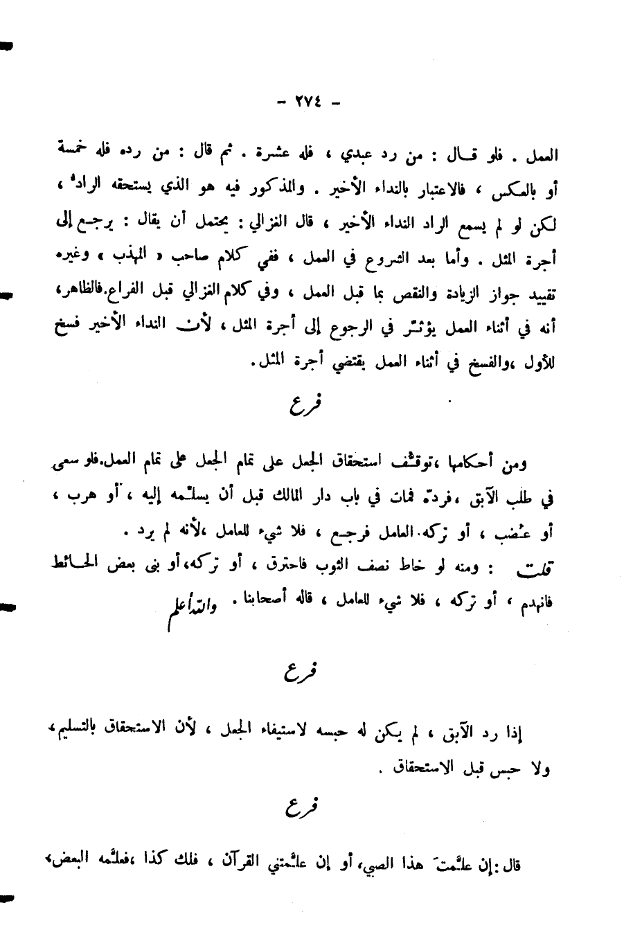 وَمِنْ أَحْكَامِهَا، تَوَقُّفُ اسْتِحْقَاقِ الْجَعْلِ عَلَى تَمَامِ الْجَعْلِ عَلَى تَمَامِ الْعَمَلِ. فَلَوْ سَعَى فِي طَلَبِ الْآبِقِ، فَرَدَّهُ فَمَاتَ فِي بَابِ دَارِ الْمَالِكِ قَبْلَ أَنْ يُسَلِّمَهُ إِلَيْهِ، أَوْ هَرَبَ، أَوْ غُصِبَ، أَوْ تَرَكَهُ الْعَامِلُ فَرَجَعَ، فَلَا شَيْءَ لِلْعَامِلِ، لِأَنَّهُ لَمْ يَرُدَّ.