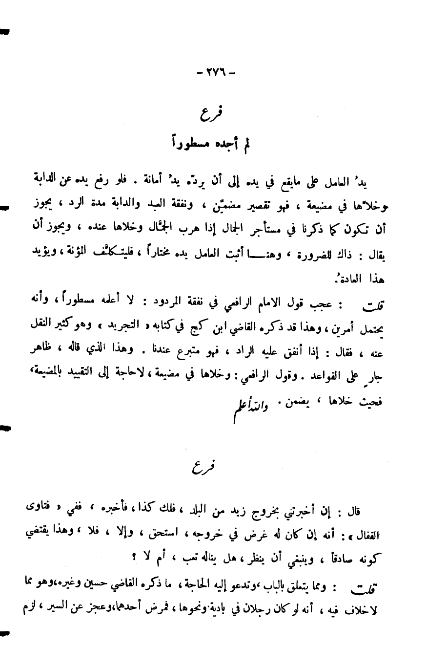 قُلْتُ: عَجَبٌ قَوْلُ الْإِمَامِ الرَّافِعِيِّ فِي نَفَقَةِ الْمَرْدُودِ: لَا أَعْلَمُهُ مَسْطُورًا، وَأَنَّهُ يَحْتَمِلُ أَمْرَيْنِ، وَهَذَا قَدْ ذَكَرَهُ الْقَاضِي ابْنُ كَجٍّ فِي كِتَابِهِ «التَّجْرِيدِ» وَهُوَ كَثِيرُ النَّقْلِ عَنْهُ، فَقَالَ: إِذَا أَنْفَقَ عَلَيْهِ الرَّادُّ، فَهُوَ مُتَبَرِّعٌ عِنْدَنَا. وَهَذَا الَّذِي قَالَهُ، ظَاهِرٌ جَارٍ عَلَى الْقَوَاعِدِ. وَقَوْلُ الرَّافِعِيِّ: وَخَلَّاهَا فِي مَضْيَعَةٍ، لَا حَاجَةَ إِلَى التَّقْيِيدِ بِالْمَضْيَعَةِ، فَحَيْثُ خَلَّاهَا، يَضْمَنُ. وَاللَّهُ أَعْلَمُ.