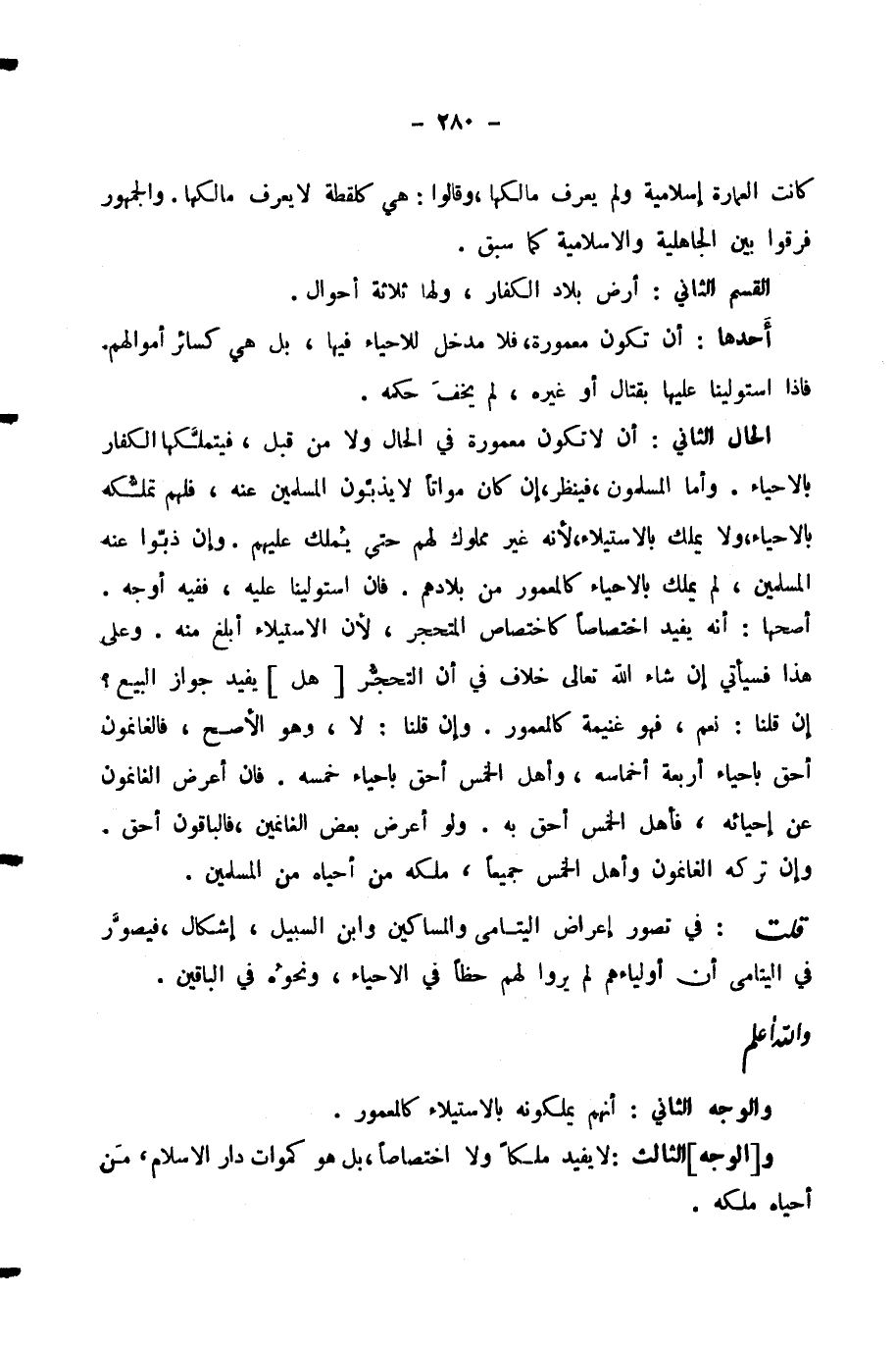الْقِسْمُ الثَّانِي: أَرْضُ بِلَادِ الْكُفَّارِ، وَلَهَا ثَلَاثَةُ أَحْوَالٍ. أَحَدُهَا: أَنْ تَكُونَ مَعْمُورَةً، فَلَا مَدْخَلَ لِلْإِحْيَاءِ فِيهَا، بَلْ هِيَ كَسَائِرِ أَمْوَالِهِمْ فَإِذَا اسْتَوْلَيْنَا عَلَيْهَا بِقِتَالٍ أَوْ غَيْرِهِ، لَمْ يَخْفَ حُكْمُهُ.