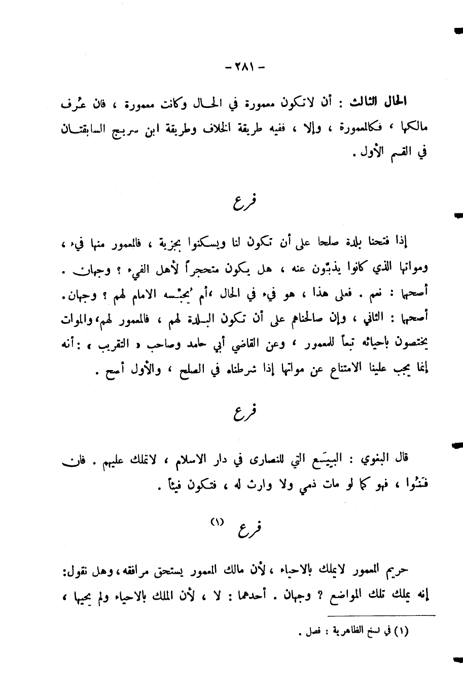 إِذَا فَتَحْنَا بَلْدَةً صُلْحًا عَلَى أَنْ تَكُونَ لَنَا وَيَسْكُنُوا بِجِزْيَةٍ، فَالْمَعْمُورُ مِنْهَا فَيْءٌ، وَمَوَاتُهَا الَّذِي كَانُوا يَذُبُّونَ عَنْهُ، هَلْ يَكُونُ مُتَحَجِّرًا لِأَهْلِ الْفَيْءِ؟ وَجْهَانِ. أَصَحُّهُمَا: نَعَمْ. فَعَلَى هَذَا، هُوَ فَيْءٌ فِي الْحَالِ، أَمْ يَحْبِسُهُ الْإِمَامُ لَهُمْ؟ وَجْهَانِ. أَصَحُّهُمَا: الثَّانِي، وَإِنْ صَالَحْنَاهُمْ عَلَى أَنْ تَكُونَ الْبَلْدَةُ لَهُمْ، فَالْمَعْمُورُ لَهُمْ، وَالْمَوَاتُ يَخْتَصُّونَ بِإِحْيَائِهِ تَبَعًا لِلْمَعْمُورِ، وَعَنِ الْقَاضِي أَبِي حَامِدٍ وَصَاحِبِ التَّقْرِيبِ: أَنَّهُ إِنَّمَا يَجِبُ عَلَيْنَا الِامْتِنَاعُ عَنْ مَوَاتِهَا إِذَا شَرَطْنَاهُ فِي الصُّلْحِ، وَالْأَوَّلُ أَصَحُّ.