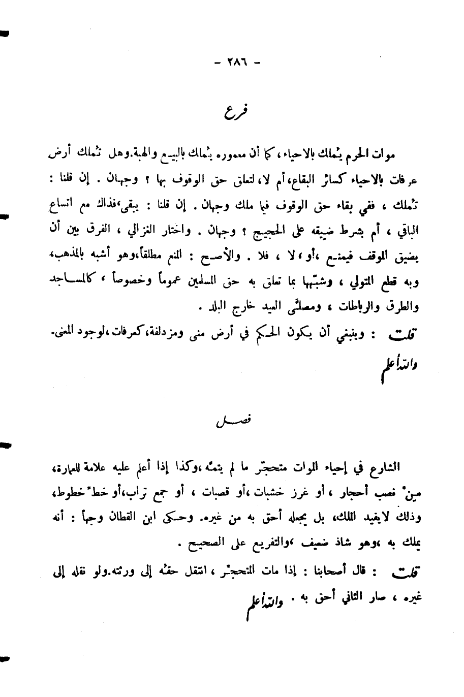 مَوَاتُ الْحَرَمِ يُمَلَّكُ بِالْإِحْيَاءِ، كَمَا أَنَّ مَعْمُورَهُ يُمَلَّكُ بِالْبَيْعِ وَالْهِبَةِ. وَهَلْ تُملَّك أَرْضُ عَرَفَاتٍ بِالْإِحْيَاءِ كَسَائِرِ الْبِقَاعِ، أَمْ لَا، لِتَعَلُّقِ حَقِّ الْوُقُوفِ بِهَا؟ وَجْهَانِ. إِنْ قُلْنَا: تُملَّك، فَفِي بَقَاءِ حَقِّ الْوُقُوفِ فِيمَا مُلِّكَ وَجْهَانِ. إِنْ قُلْنَا: يَبْقَى، فَذَاكَ مَعَ اتِّسَاعِ الْبَاقِي، أَمْ بِشَرْطِ ضِيقِهِ عَلَى الْحَجِيجِ؟ وَجْهَانِ. وَاخْتَارَ الْغَزَالِيُّ، الْفَرْقَ بَيْنَ أَنْ يَضِيقَ الْمَوْقِفُ فَيُمْنَعَ، أَوْ، لَا، فَلَا.