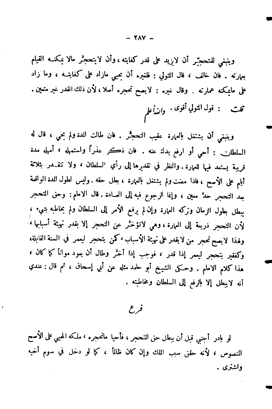وَالنَّظَرُ فِي تَقْدِيرِهَا إِلَى رَأْيِ السُّلْطَانِ، وَلَا تَتَقَدَّرُ بِثَلَاثَةِ أَيَّامٍ عَلَى الْأَصَحِّ، فَإِذَا مَضَتْ وَلَمْ يَشْتَغِلْ بِالْعِمَارَةِ، بَطَلَ حَقُّهُ. وَلَيْسَ لِطُولِ الْمُدَّةِ الْوَاقِعَةِ بَعْدَ التَّحَجُّرِ حَدٌّ مُعَيَّنٌ، وَإِنَّمَا الرُّجُوعُ فِيهِ إِلَى الْعَادَةِ. قَالَ الْإِمَامُ: وَحَقُّ الْمُتَحَجِّرِ يَبْطُلُ بِطُولِ الزَّمَانِ وَتَرْكِهِ الْعِمَارَةَ وَإِنْ لَمْ يَرْفَعِ الْأَمْرَ إِلَى السُّلْطَانِ وَلَمْ يُخَاطِبْهُ بِشَيْءٍ، لِأَنَّ التَّحَجُّرَ ذَرِيعَةٌ إِلَى الْعِمَارَةِ، وَهِيَ لَا تُؤَخَّرُ عَنِ التَّحَجُّرِ إِلَّا بِقَدْرِ تَهْيِئَةِ أَسْبَابِهَا، وَلِهَذَا لَا يَصِحُّ تَحَجُّرُ مَنْ لَا يَقْدِرُ عَلَى تَهْيِئَةِ الْأَسْبَابِ، كَمَنْ يَتَحَجَّرُ لِيُعَمِّرَ فِي السَّنَةِ الْقَابِلَةِ، وَكَفَقِيرٍ يَتَحَجَّرُ لِيُعَمِّرَ إِذَا قَدَرَ، فَوَجَبَ إِذَا أَخَّرَ وَطَالَ أَنْ يَعُودَ مَوَاتًا كَمَا كَانَ، هَذَا كَلَامُ الْإِمَامِ. وَحَكَى الشَّيْخُ أَبُو حَامِدٍ مِثْلَهُ عَنْ أَبِي إِسْحَاقَ، ثُمَّ قَالَ: عِنْدِي أَنَّهُ لَا يَبْطُلُ إِلَّا بِالرَّفْعِ إِلَى السُّلْطَانِ وَمُخَاطَبَتِهِ.