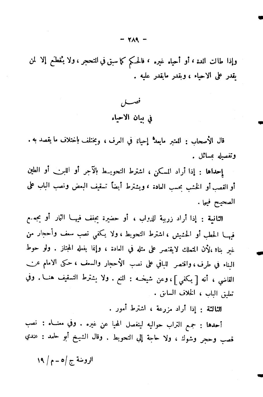 فِي بَيَانِ الْإِحْيَاءِ قَالَ الْأَصْحَابُ: الْمُعْتَبَرُ مَا يُعَدُّ إِحْيَاءً فِي الْعُرْفِ، وَيَخْتَلِفُ بِاخْتِلَافِ مَا يُقْصَدُ بِهِ. وَتَفْصِيلُهُ بِمَسَائِلَ.