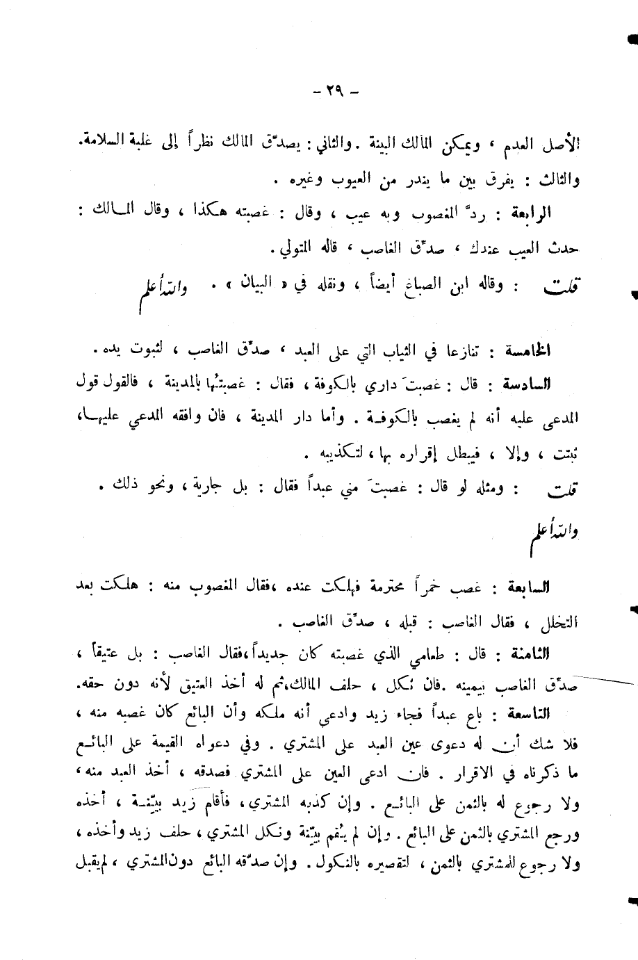التَّاسِعَةُ: بَاعَ عَبْدًا فَجَاءَ زَيْدٌ وَادَّعَى أَنَّهُ مِلْكُهُ وَأَنَّ الْبَائِعَ كَانَ غَصَبَهُ مِنْهُ، فَلَا شَكَّ أَنَّ لَهُ دَعْوَى عَيْنِ الْعَبْدِ عَلَى الْمُشْتَرِي. وَفِي دَعْوَاهُ الْقِيمَةُ عَلَى الْبَائِعِ مَا ذَكَرْنَاهُ فِي الْإِقْرَارِ. فَإِنِ ادَّعَى الْعَيْنَ عَلَى الْمُشْتَرِي فَصَدَّقَهُ أَخَذَ الْعَبْدَ مِنْهُ، وَلَا رُجُوعَ لَهُ بِالثَّمَنِ عَلَى الْبَائِعِ. وَإِنْ كَذَّبَهُ الْمُشْتَرِي، فَأَقَامَ زَيْدٌ بَيِّنَةً، أَخَذَهُ وَرَجَعَ الْمُشْتَرِي بِالثَّمَنِ عَلَى الْبَائِعِ. وَإِنْ لَمْ يُقِمْ بَيِّنَةً وَنَكَلَ الْمُشْتَرِي، حَلَفَ زَيْدٌ وَأَخَذَهُ، وَلَا رُجُوعَ لِلْمُشْتَرِي بِالثَّمَنِ، لِتَقْصِيرِهِ بِالنُّكُولِ. وَإِنْ صَدَّقَهُ الْبَائِعُ دُونَ الْمُشْتَرِي، لَمْ يُقْبَلْ