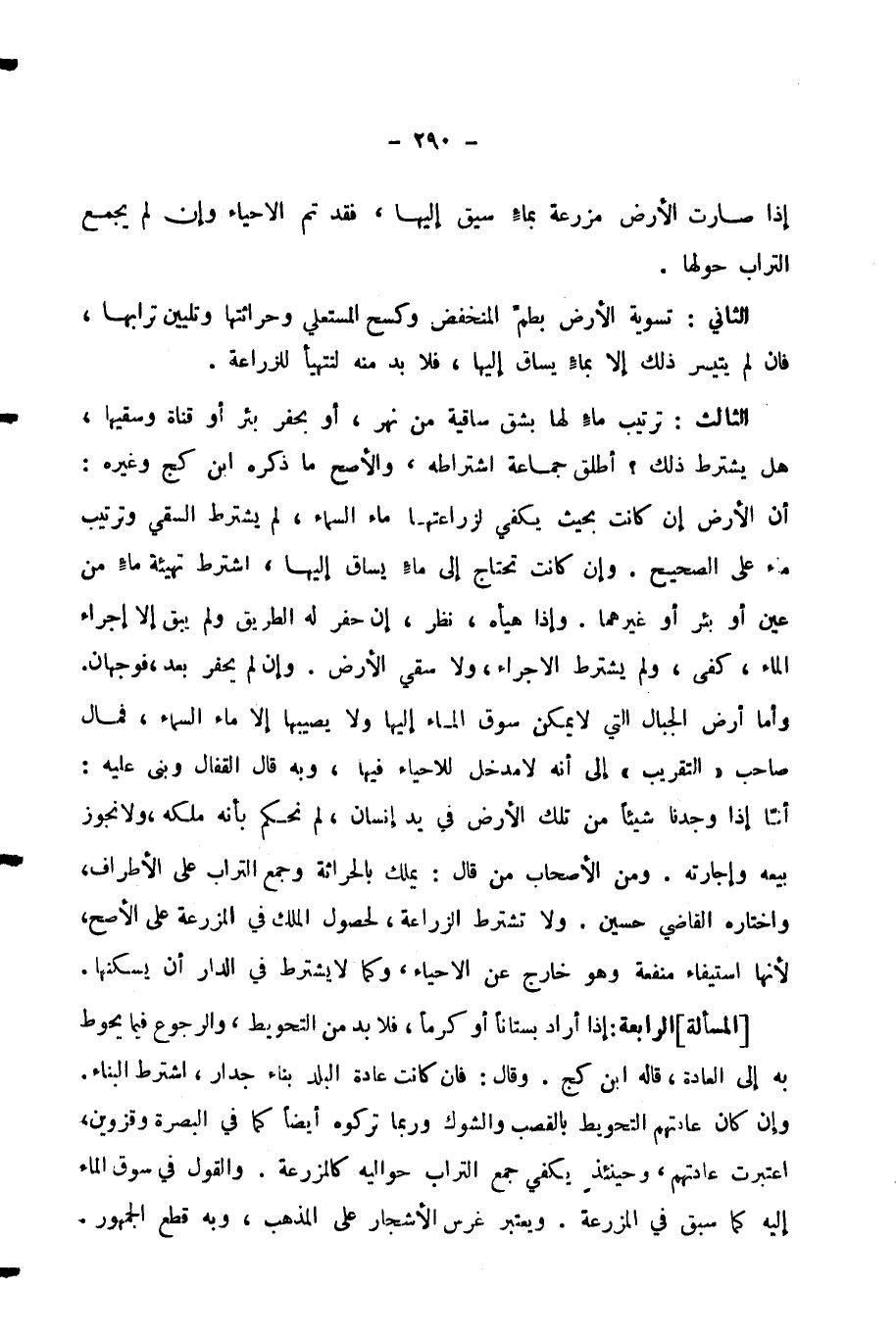 الثَّانِي: تَسْوِيَةُ الْأَرْضِ بِطَمِّ الْمُنْخَفِضِ وَكَسْحِ الْمُسْتَعْلِي وَحِرَاثَتِهَا وَتَلْيِينِ تُرَابِهَا، فَإِنْ لَمْ يَتَيَسَّرْ ذَلِكَ إِلَّا بِمَاءٍ يُسَاقُ إِلَيْهَا، فَلَا بُدَّ مِنْهُ لِتَتَهَيَّأَ لِلزِّرَاعَةِ. الثَّالِثُ: تَرْتِيبُ مَاءٍ لَهَا بِشَقِّ سَاقِيَةٍ مِنْ نَهْرٍ، أَوْ بِحَفْرِ بِئْرٍ أَوْ قَنَاةٍ وَسَقْيُهَا، هَلْ يُشْتَرَطُ ذَلِكَ؟ أَطْلَقَ جَمَاعَةٌ اشْتِرَاطَهُ، وَالْأَصَحُّ مَا ذَكَرَهُ ابْنُ كَجٍّ وَغَيْرُهُ: أَنَّ الْأَرْضَ إِنْ كَانَتْ بِحَيْثُ يَكْفِي لِزِرَاعَتِهَا مَاءُ السَّمَاءِ، لَمْ يُشْتَرَطِ السَّقْيُ وَتَرْتِيبُ مَاءٍ عَلَى الصَّحِيحِ. وَإِنْ كَانَتْ تَحْتَاجُ إِلَى مَاءٍ يُسَاقُ إِلَيْهَا، اشْتُرِطَ تَهْيِئَةُ مَاءٍ مِنْ عَيْنٍ أَوْ بِئْرٍ أَوْ غَيْرِهِمَا. وَإِذَا هَيَّأَهُ، نُظِرَ، إِنْ حَفَرَ لَهُ الطَّرِيقَ وَلَمْ يَبْقَ إِلَّا إِجْرَاءُ الْمَاءِ، كَفَى، وَلَمْ يُشْتَرَطِ الْإِجْرَاءُ، وَلَا سَقْيُ الْأَرْضِ. وَإِنْ لَمْ يُحْفَرْ بَعْدُ، فَوَجْهَانِ.