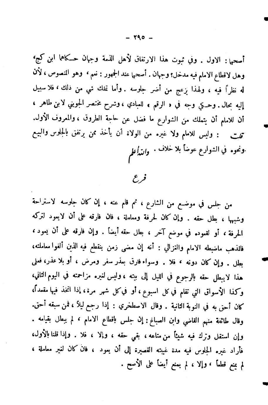 مَنْ جَلَسَ فِي مَوْضِعٍ مِنَ الشَّارِعِ، ثُمَّ قَامَ عَنْهُ، إِنْ كَانَ جُلُوسُهُ لِاسْتِرَاحَةٍ وَشِبْهِهَا، بَطَلَ حَقُّهُ. وَإِنْ كَانَ لِحِرْفَةٍ وَمُعَامَلَةٍ، فَإِنْ فَارَقَهُ عَلَى أَنْ لَا يَعُودَ لِتَرْكِهِ الْحِرْفَةَ، أَوْ لِقُعُودِهِ فِي مَوْضِعٍ آخَرَ، بَطَلَ حَقُّهُ أَيْضًا. وَإِنْ فَارَقَهُ عَلَى أَنْ يَعُودَ فَالْمَذْهَبُ مَا ضَبَطَهُ الْإِمَامُ وَالْغَزَالِيُّ: أَنَّهُ إِنْ مَضَى زَمَنٌ يَنْقَطِعُ فِيهِ الَّذِينَ أَلِفُوا مُعَامَلَتَهُ، بَطَلَ. وَإِنْ كَانَ دُونَهُ، فَلَا. وَسَوَاءٌ فَارَقَ بِعُذْرِ سَفَرٍ وَمَرَضٍ، أَوْ بِلَا عُذْرٍ، فَعَلَى هَذَا لَا يَبْطُلُ حَقُّهُ بِالرُّجُوعِ فِي اللَّيْلِ إِلَى بَيْتِهِ، وَلَيْسَ لِغَيْرِهِ مُزَاحَمَتُهُ فِي الْيَوْمِ الثَّانِي، وَكَذَا الْأَسْوَاقُ الَّتِي تُقَامُ فِي كُلِّ أُسْبُوعٍ، أَوْ فِي كُلِّ شَهْرٍ مَرَّةً، إِذَا اتَّخَذَ فِيهَا مَقْعَدًا، كَانَ أَحَقَّ بِهِ فِي النَّوْبَةِ الثَّانِيَةِ.