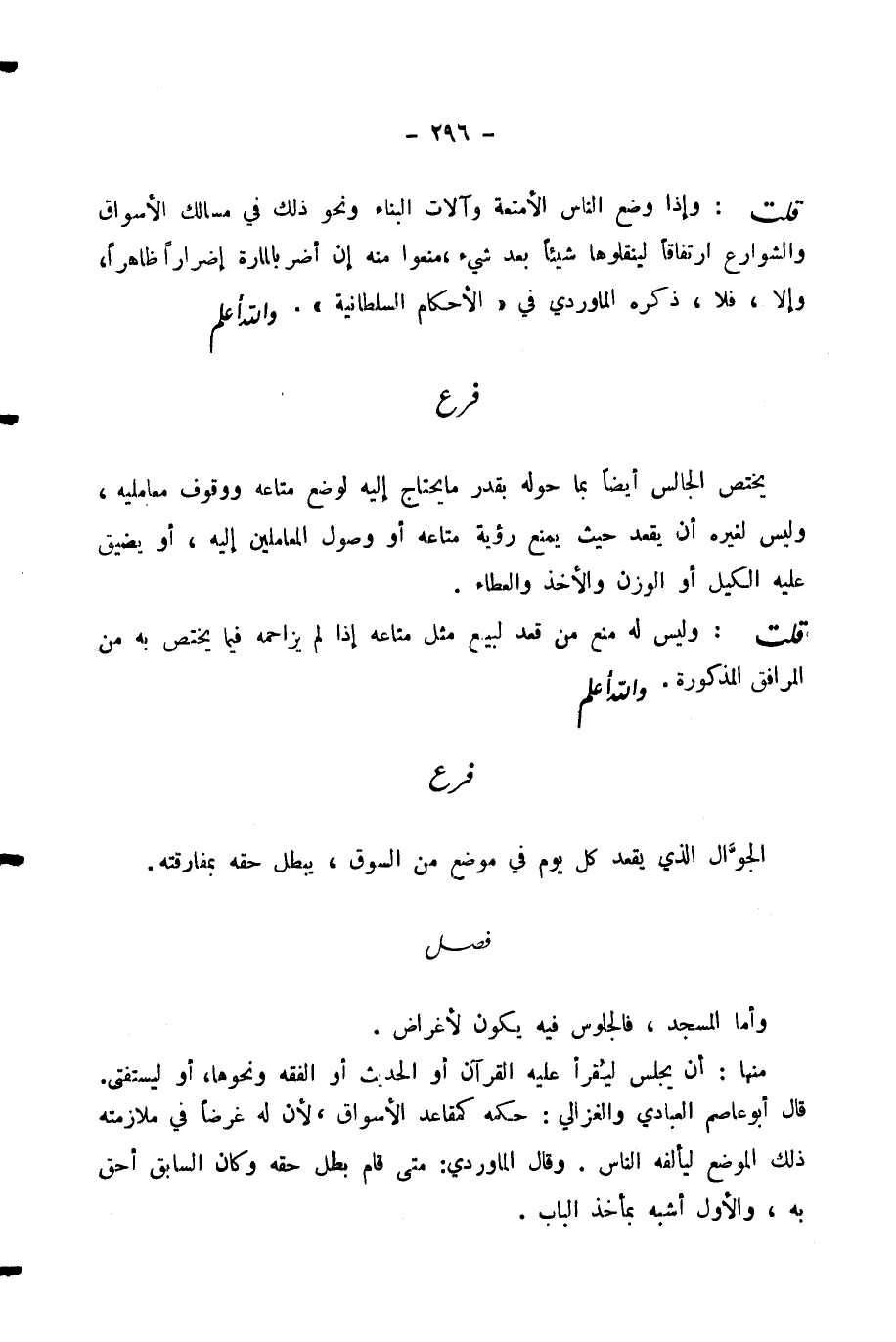 قُلْتُ: وَإِذَا وَضَعَ النَّاسُ الْأَمْتِعَةَ وَآلَاتِ الْبِنَاءِ وَنَحْوَ ذَلِكَ فِي مَسَالِكِ الْأَسْوَاقِ وَالشَّوَارِعِ ارْتِفَاقًا لِيَنْقُلُوهَا شَيْئًا بَعْدَ شَيْءٍ، مُنِعُوا مِنْهُ إِنْ أَضَرَّ بِالْمَارَّةِ إِضْرَارًا ظَاهِرًا، وَإِلَّا فَلَا، ذَكَرَهُ الْمَاوَرْدِيُّ فِي «الْأَحْكَامِ السُّلْطَانِيَّةِ» . وَاللَّهُ أَعْلَمُ.