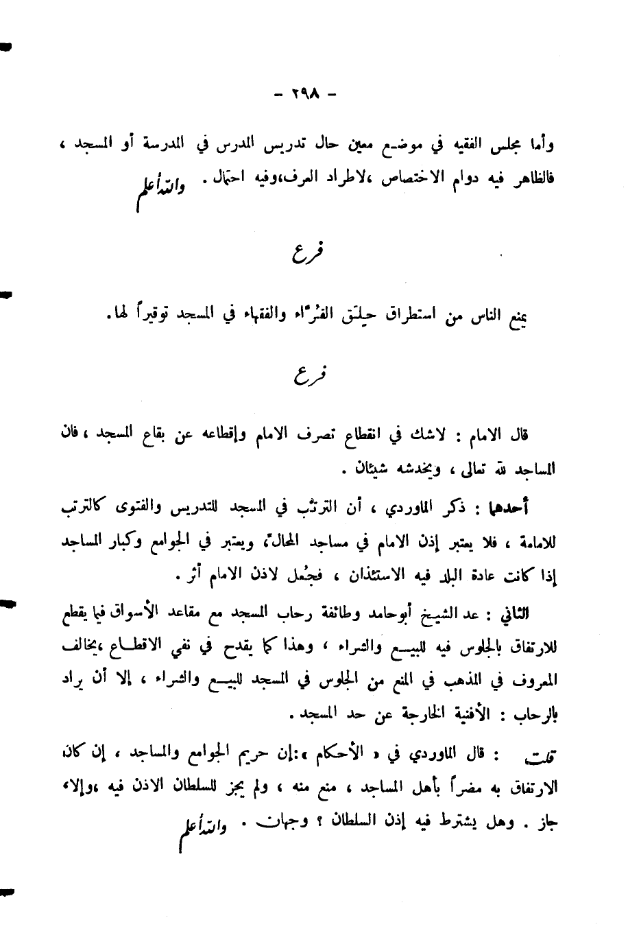 قَالَ الْإِمَامُ: لَا شَكَّ فِي انْقِطَاعِ تَصَرُّفِ الْإِمَامِ وَإِقْطَاعِهِ عَنْ بِقَاعِ الْمَسْجِدِ، فَإِنَّ الْمَسَاجِدَ لِلَّهِ تَعَالَى، وَيَخْدِشُهُ شَيْئَانِ. أَحَدُهُمَا: ذَكَرَ الْمَاوَرْدِيُّ، أَنَّ التَّرَتُّبَ فِي الْمَسْجِدِ لِلتَّدْرِيسِ وَالْفَتْوَى كَالتَّرَتُّبِ لِلْإِمَامَةِ، فَلَا يُعْتَبَرُ إِذْنُ الْإِمَامِ فِي مَسَاجِدِ الْمَحَالِّ، وَيُعْتَبَرُ فِي الْجَوَامِعِ وَكِبَارِ الْمَسَاجِدِ إِذَا كَانَتْ عَادَةُ الْبَلَدِ فِيهِ الِاسْتِئْذَانَ، فَجُعِلَ لِإِذْنِ الْإِمَامِ أَثَرٌ. الثَّانِي: عَدَّ الشَّيْخُ أَبُو حَامِدٍ وَطَائِفَةٌ رِحَابَ الْمَسْجِدِ مَعَ مَقَاعِدِ الْأَسْوَاقِ فِيمَا يُقْطَعُ لِلِارْتِفَاقِ بِالْجُلُوسِ فِيهِ لِلْبَيْعِ وَالشِّرَاءِ، وَهَذَا كَمَا يَقْدَحُ فِي نَفْيِ الْإِقْطَاعِ، يُخَالِفُ الْمَعْرُوفَ فِي الْمَذْهَبِ فِي الْمَنْعِ مِنَ الْجُلُوسِ فِي الْمَسْجِدِ لِلْبَيْعِ وَالشِّرَاءِ، إِلَّا أَنْ يُرَادَ بِالرِّحَابِ: الْأَفْنِيَةُ الْخَارِجَةُ عَنْ حَدِّ الْمَسْجِدِ.