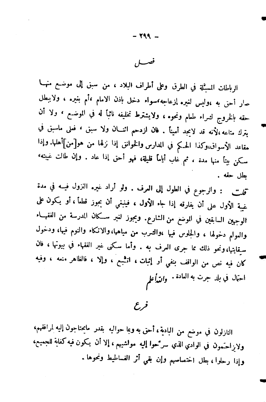قُلْتُ: وَالرُّجُوعُ فِي الطُّولِ إِلَى الْعُرْفِ. وَلَوْ أَرَادَ غَيْرُهُ النُّزُولَ فِيهِ فِي مُدَّةِ غَيْبَةِ الْأَوَّلِ عَلَى أَنْ يُفَارِقَهُ إِذَا جَاءَ الْأَوَّلُ، فَيَنْبَغِي أَنْ يَجُوزَ قَطْعًا، أَوْ يَكُونَ عَلَى الْوَجْهَيْنِ السَّابِقَيْنِ فِي الْمَوْضِعِ مِنَ الشَّارِعِ. وَيَجُوزُ لِغَيْرِ سُكَّانِ الْمَدْرَسَةِ مِنَ الْفُقَهَاءِ وَالْعَوَامِّ دُخُولُهَا، وَالْجُلُوسُ فِيهَا، وَالشُّرْبُ مِنْ مِيَاهِهَا، وَالِاتِّكَاءُ وَالنَّوْمُ فِيهَا، وَدُخُولُ سِقَايَتِهَا، وَنَحْوُ ذَلِكَ مِمَّا جَرَى الْعُرْفُ بِهِ. وَأَمَّا سُكْنَى غَيْرِ الْفُقَهَاءِ فِي بُيُوتِهَا، فَإِنْ كَانَ فِيهِ نَصٌّ مِنَ الْوَاقِفِ بِنَفْيٍ أَوْ إِثْبَاتٍ، اتُّبِعَ، وَإِلَّا، فَالظَّاهِرُ مَنْعُهُ، وَفِيهِ احْتِمَالٌ فِي بَلَدٍ جَرَتْ بِهِ الْعَادَةُ. وَاللَّهُ أَعْلَمُ.