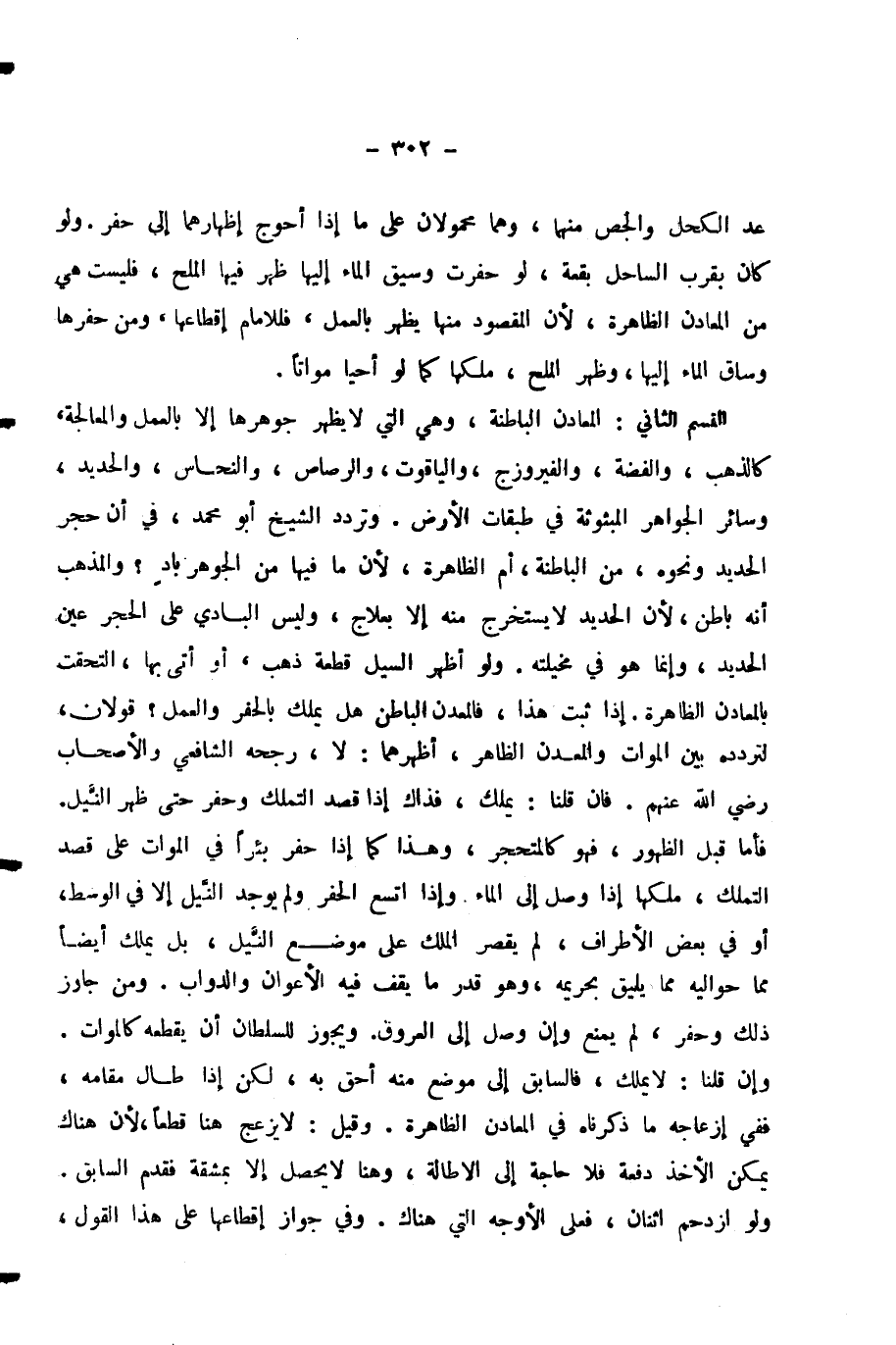 الْقِسْمُ الثَّانِي: الْمَعَادِنُ الْبَاطِنَةُ، وَهِيَ الَّتِي لَا يَظْهَرُ جَوْهَرُهَا إِلَّا بِالْعَمَلِ وَالْمُعَالَجَةِ، كَالذَّهَبِ، وَالْفِضَّةِ، وَالْفَيْرُوزَجِ، وَالْيَاقُوتِ، وَالرَّصَاصِ، وَالنُّحَاسِ، وَالْحَدِيدِ، وَسَائِرِ الْجَوَاهِرِ الْمَبْثُوثَةِ فِي طَبَقَاتِ الْأَرْضِ. وَتَرَدَّدَ الشَّيْخُ أَبُو مُحَمَّدٍ، فِي أَنَّ حَجَرَ الْحَدِيدِ وَنَحْوَهُ، مِنَ الْبَاطِنَةِ، أَمِ الظَّاهِرَةِ، لِأَنَّ مَا فِيهَا مِنَ الْجَوْهَرِ بَادٍ؟ وَالْمَذْهَبُ أَنَّهُ بَاطِنٌ، لِأَنَّ الْحَدِيدَ لَا يُسْتَخْرَجُ مِنْهُ إِلَّا بِعِلَاجٍ، وَلَيْسَ الْبَادِي عَلَى الْحَجَرِ عَيْنَ الْحَدِيدِ، وَإِنَّمَا هُوَ فِي مُخَيِّلَتِهِ. وَلَوْ أَظْهَرَ السَّيْلُ قِطْعَةَ ذَهَبٍ، أَوْ أَتَى بِهَا، الْتَحَقَتْ بِالْمَعَادِنِ الظَّاهِرَةِ. إِذَا ثَبَتَ هَذَا، فَالْمَعْدِنُ الْبَاطِنُ هَلْ يُمَلَّكُ بِالْحَفْرِ وَالْعَمَلِ؟ قَوْلَانِ، لِتَرَدُّدِهِ بَيْنَ الْمَوَاتِ وَالْمَعْدِنِ الظَّاهِرِ، أَظْهَرُهُمَا: لَا، رَجَّحَهُ الشَّافِعِيُّ وَالْأَصْحَابُ - رَضِيَ اللَّهُ عَنْهُمْ -. فَإِنْ قُلْنَا: يُمَلَّكُ، فَذَاكَ إِذَا قَصَدَ التَّمَلُّكَ وَحَفَرَ حَتَّى ظَهَرَ النَّيْلُ. فَأَمَّا قَبْلَ الظُّهُورِ، فَهُوَ كَالْمُتَحَجِّرِ، وَهَذَا كَمَا إِذَا حَفَرَ بِئْرًا فِي الْمَوَاتِ عَلَى قَصْدِ التَّمَلُّكِ، مُلِّكَهَا إِذَا وَصَلَ إِلَى الْمَاءِ. وَإِذَا اتَّسَعَ الْحَفْرُ وَلَمْ يُوجَدِ النَّيْلُ إِلَّا فِي الْوَسَطِ، أَوْ فِي بَعْضِ الْأَطْرَافِ، لَمْ يَقْصُرِ الْمِلْكُ عَلَى مَوْضِعِ النَّيْلِ، بَلْ يُمَلَّكُ أَيْضًا مِمَّا حَوَالَيْهِ مِمَّا يَلِيقُ بِحَرِيمِهِ، وَهُوَ قَدْرُ مَا يَقِفُ فِيهِ الْأَعْوَانُ وَالدَّوَابُّ. وَمَنْ جَاوَزَ ذَلِكَ وَحَفَرَ، لَمْ يُمْنَعْ وَإِنْ وَصَلَ إِلَى الْعُرُوقِ. وَيَجُوزُ لِلسُّلْطَانِ أَنْ يُقْطِعَهُ كَالْمَوَاتِ. وَإِنْ قُلْنَا: لَا يُمَلَّكُ، فَالسَّابِقُ إِلَى مَوْضِعٍ مِنْهُ أَحَقُّ بِهِ، لَكِنْ إِذَا طَالَ مَقَامُهُ، فَفِي إِزْعَاجِهِ مَا ذَكَرْنَاهُ فِي الْمَعَادِنِ الظَّاهِرَةِ. وَقِيلَ: لَا يُزْعَجُ هُنَا قَطْعًا، لِأَنَّ هُنَاكَ يُمْكِنُ الْأَخْذُ دَفْعَةً فَلَا حَاجَةَ إِلَى الْإِطَالَةِ، وَهُنَا لَا يَحْصُلُ إِلَّا بِمَشَقَّةٍ فَقُدِّمَ السَّابِقُ. وَلَوِ ازْدَحَمَ اثْنَانِ، فَعَلَى الْأَوْجُهِ الَّتِي هُنَاكَ. وَفِي جَوَازِ إِقْطَاعِهَا عَلَى هَذَا الْقَوْلِ،