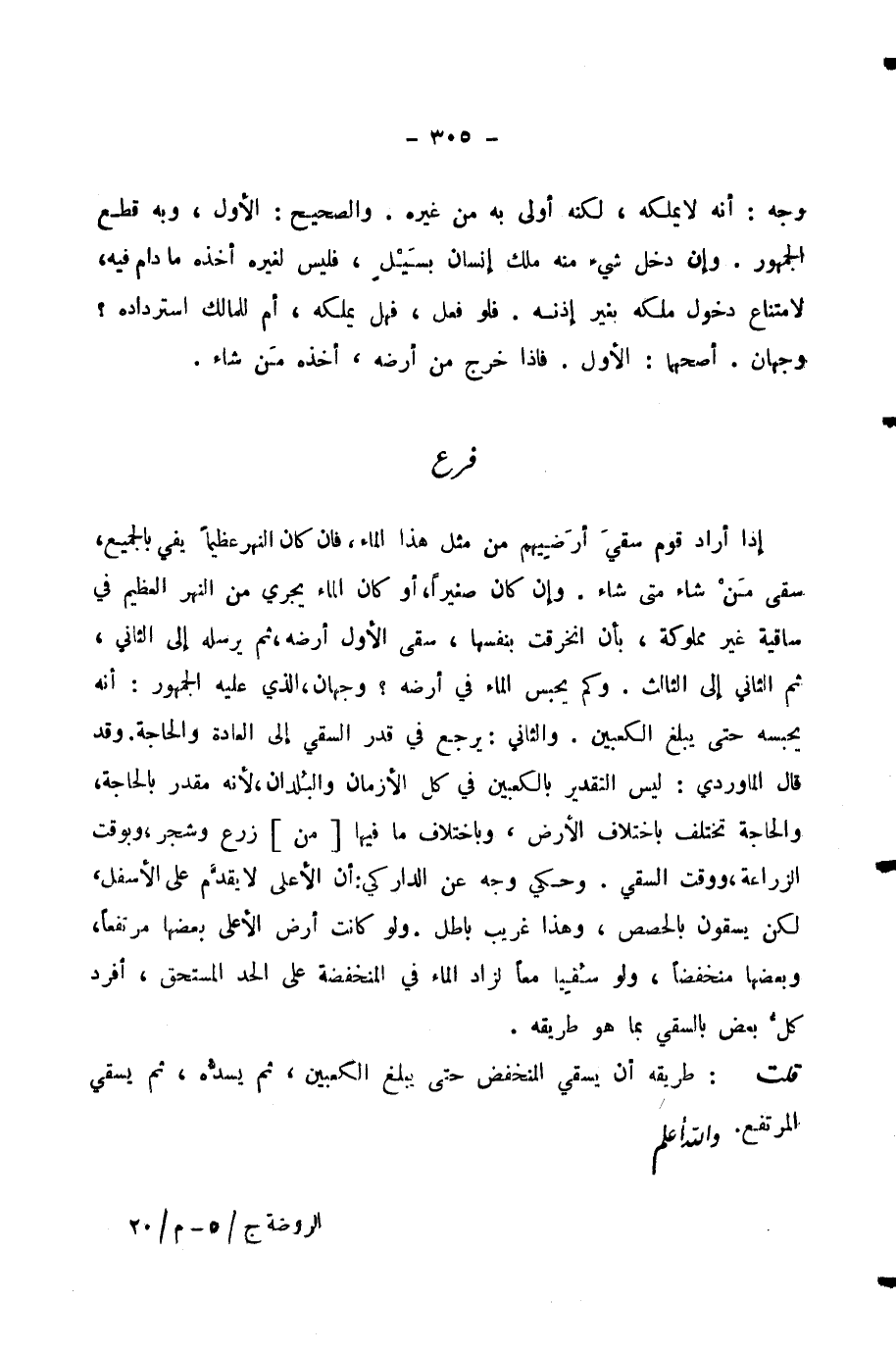 إِذَا أَرَادَ قَوْمٌ سَقْيَ أَرَضِيهِمْ مِنْ مِثْلِ هَذَا الْمَاءِ، فَإِنْ كَانَ النَّهْرُ عَظِيمًا يَفِي بِالْجَمِيعِ، سَقَى مَنْ شَاءَ مَتَى شَاءَ. وَإِنْ كَانَ صَغِيرًا، أَوْ كَانَ الْمَاءُ يَجْرِي مِنَ النَّهْرِ الْعَظِيمِ فِي سَاقِيَةٍ غَيْرِ مَمْلُوكَةٍ، بِأَنِ انْخَرَقَتْ بِنَفْسِهَا، سَقَى الْأَوَّلُ أَرْضَهُ، ثُمَّ يُرْسِلُهُ إِلَى الثَّانِي، ثُمَّ الثَّانِي إِلَى الثَّالِثِ. وَكَمْ يَحْبِسُ الْمَاءَ فِي أَرْضِهِ؟ وَجْهَانِ، الَّذِي عَلَيْهِ الْجُمْهُورُ: أَنَّهُ يَحْبِسُهُ حَتَّى يَبْلُغَ الْكَعْبَيْنِ.