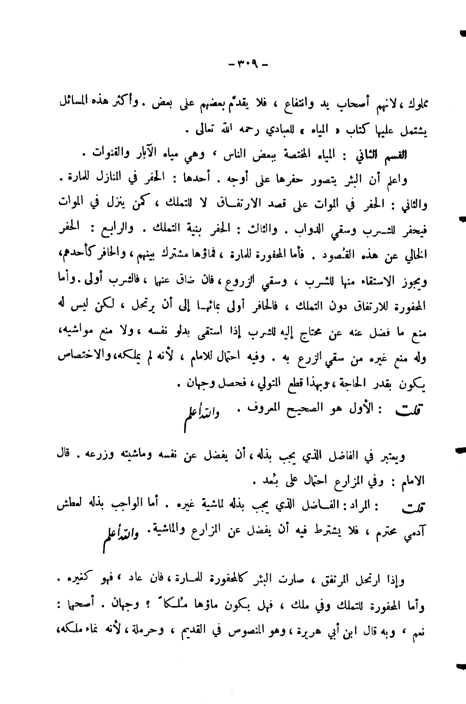 الْقِسْمُ الثَّانِي: الْمِيَاهُ الْمُخْتَصَّةُ بِبَعْضِ النَّاسِ، وَهِيَ مِيَاهُ الْآبَارِ وَالْقَنَوَاتِ.