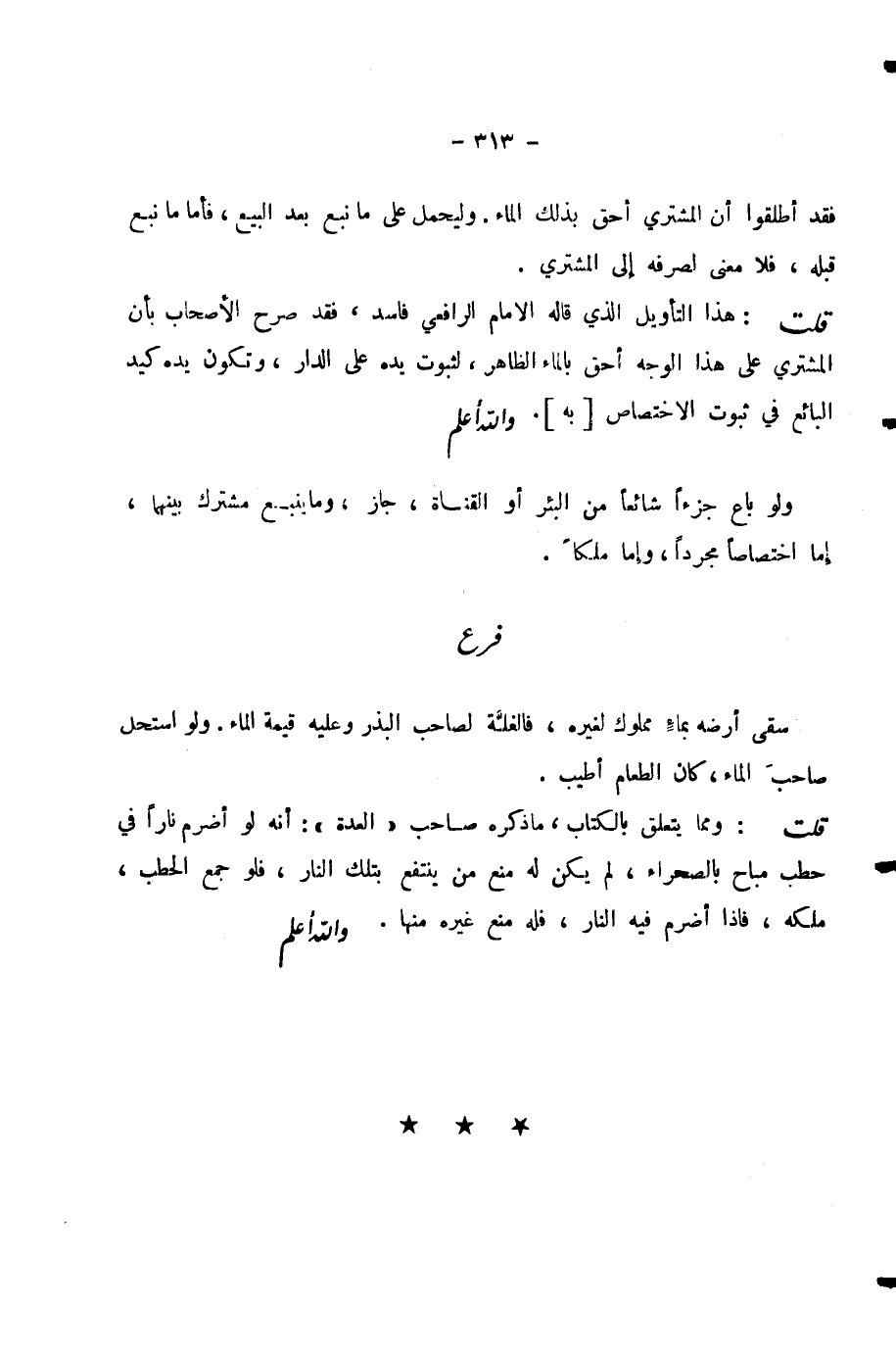قُلْتُ: هَذَا التَّأْوِيلُ الَّذِي قَالَهُ الْإِمَامُ الرَّافِعِيُّ فَاسِدٌ، فَقَدْ صَرَّحَ الْأَصْحَابُ بِأَنَّ الْمُشْتَرِيَ عَلَى هَذَا الْوَجْهِ أَحَقُّ بِالْمَاءِ الظَّاهِرِ، لِثُبُوتِ يَدِهِ عَلَى الدَّارِ، وَتَكُونُ يَدُهُ كَيَدِ الْبَائِعِ فِي ثُبُوتِ الِاخْتِصَاصِ [بِهِ] . وَاللَّهُ أَعْلَمُ.