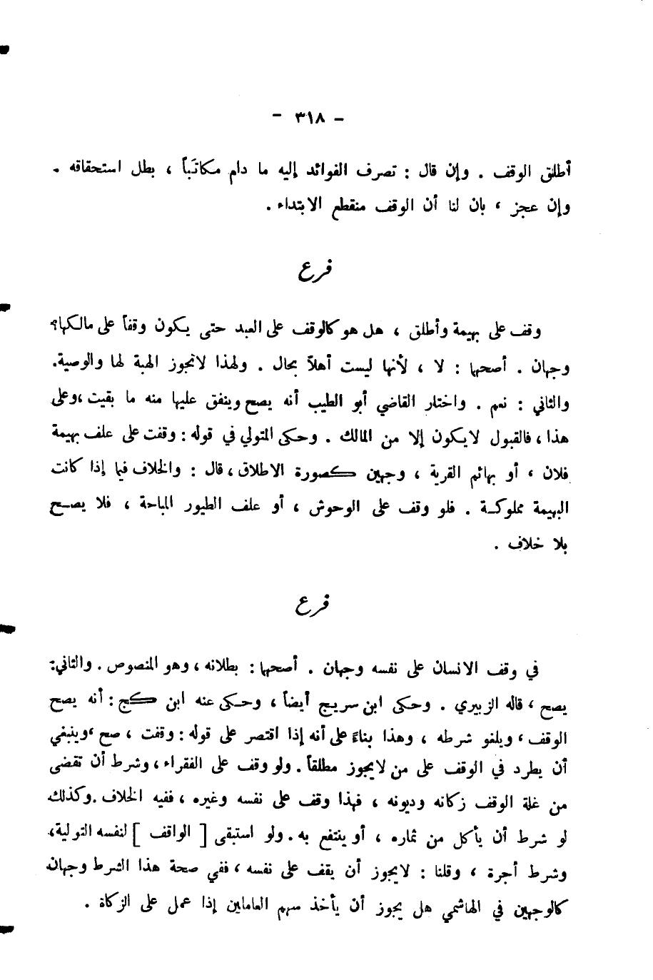 وَقَفَ عَلَى بَهِيمَةٍ وَأَطْلَقَ، هَلْ هُوَ كَالْوَقْفِ عَلَى الْعَبْدِ حَتَّى يَكُونَ وَقْفًا عَلَى مَالِكِهَا؟ وَجْهَانِ. أَصَحُّهُمَا: لَا، لِأَنَّهَا لَيْسَتْ أَهْلًا بِحَالٍ. وَلِهَذَا لَا تَجُوزُ الْهِبَةُ لَهَا وَالْوَصِيَّةُ.