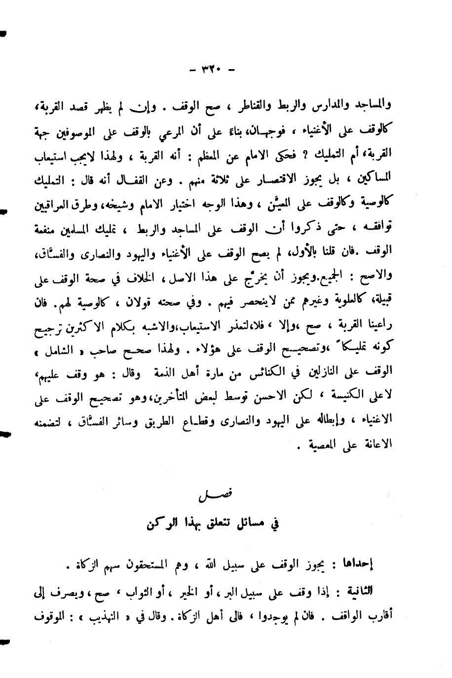 وَالْمَسَاجِدِ وَالْمَدَارِسِ وَالرُّبُطِ وَالْقَنَاطِرِ، صَحَّ الْوَقْفُ. وَإِنْ لَمْ يَظْهَرِ الْقُرْبَةُ، كَالْوَقْفِ عَلَى الْأَغْنِيَاءِ، فَوَجْهَانِ، بِنَاءً عَلَى أَنَّ الْمَرْعِيَّ بِالْوَقْفِ عَلَى الْمَوْصُوفِينَ جِهَةُ الْقُرْبَةِ، أَمِ التَّمْلِيكُ؟ فَحَكَى الْإِمَامُ عَنِ الْمُعَظَّمِ: أَنَّهُ الْقُرْبَةُ، وَلِهَذَا لَا يَجِبُ اسْتِيعَابُ الْمَسَاكِينَ، بَلْ يَجُوزُ الِاقْتِصَارُ عَلَى ثَلَاثَةٍ مِنْهُمْ. وَعَنِ الْقَفَّالِ أَنَّهُ قَالَ: التَّمْلِيكُ كَالْوَصِيَّةِ وَكَالْوَقْفِ عَلَى الْمُعَيَّنِ، وَهَذَا الْوَجْهُ اخْتِيَارُ الْإِمَامِ وَشَيْخِهِ، وَطُرُقُ الْعِرَاقِيِّينَ تُوَافِقُهُ، حَتَّى ذَكَرُوا أَنَّ الْوَقْفَ عَلَى الْمَسَاجِدِ وَالرُّبُطِ، تَمْلِيكُ الْمُسْلِمِينَ مَنْفَعَةَ الْوَقْفِ. فَإِنْ قُلْنَا بِالْأَوَّلِ، لَمْ يَصِحَّ الْوَقْفُ عَلَى الْأَغْنِيَاءِ وَالْيَهُودِ وَالنَّصَارَى وَالْفُسَّاقِ، وَالْأَصَحُّ: الْجَمِيعُ.