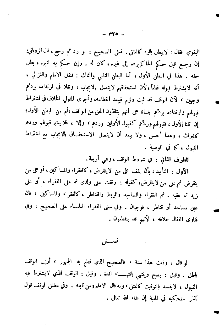 الْبَغَوِيُّ فَقَالَ: لَا يَبْطُلُ بِالرَّدِّ كَالْعِتْقِ. فَعَلَى الصَّحِيحِ: لَوْ رَدَّ ثُمَّ رَجَعَ، قَالَ الرُّويَانِيُّ: إِنْ رَجَعَ قَبْلَ حُكْمِ الْحَاكِمِ بِرَدِّهِ إِلَى غَيْرِهِ كَانَ لَهُ. وَإِنْ حَكَمَ بِهِ لِغَيْرِهِ بَطَلَ حَقُّهُ. هَذَا فِي الْبَطْنِ الْأَوَّلِ، أَمَّا الْبَطْنُ الثَّانِي وَالثَّالِثُ: فَنَقَلَ الْإِمَامُ، وَالْغَزَالِيُّ، أَنَّهُ لَا يُشْتَرَطُ قَبُولُهُ قَطْعًا، لِأَنَّ اسْتِحْقَاقَهُمْ لَا يَتَّصِلُ بِالْإِيجَابِ، وَنَقَلَا فِي ارْتِدَادِهِ بِرَدِّهِمْ وَجْهَيْنِ، لِأَنَّ الْوَقْفَ قَدْ ثَبَتَ وَلَزِمَ فَيَبْعُدُ انْقِطَاعُهُ، وَأَجْرَى الْمُتَوَلِّي الْخِلَافَ فِي اشْتِرَاطِ قَبُولِهِمْ، وَارْتِدَادِهِ بِرَدِّهِمْ بِنَاءً عَلَى أَنَّهُمْ يَتَلَقَّوْنَ الْحَقَّ مِنَ الْوَاقِفِ، أَمْ مِنَ الْبَطْنِ الْأَوَّلِ؟ إِنْ قُلْنَا بِالْأَوَّلِ، فَقَبُولُهُمْ وَرَدُّهُمْ كَقَبُولِ الْأَوَّلِينَ وَرَدِّهِمْ، وَإِلَّا فَلَا يُعْتَبَرُ قَبُولُهُمْ، وَرَدُّهُمْ كَالْمِيرَاثِ، وَهَذَا أَحْسَنُ، وَلَا يَبْعُدُ أَنْ لَا يَتَّصِلَ الِاسْتِحْقَاقُ بِالْإِيجَابِ مَعَ اشْتِرَاطِ الْقَبُولِ، كَمَا فِي الْوَصِيَّةِ.