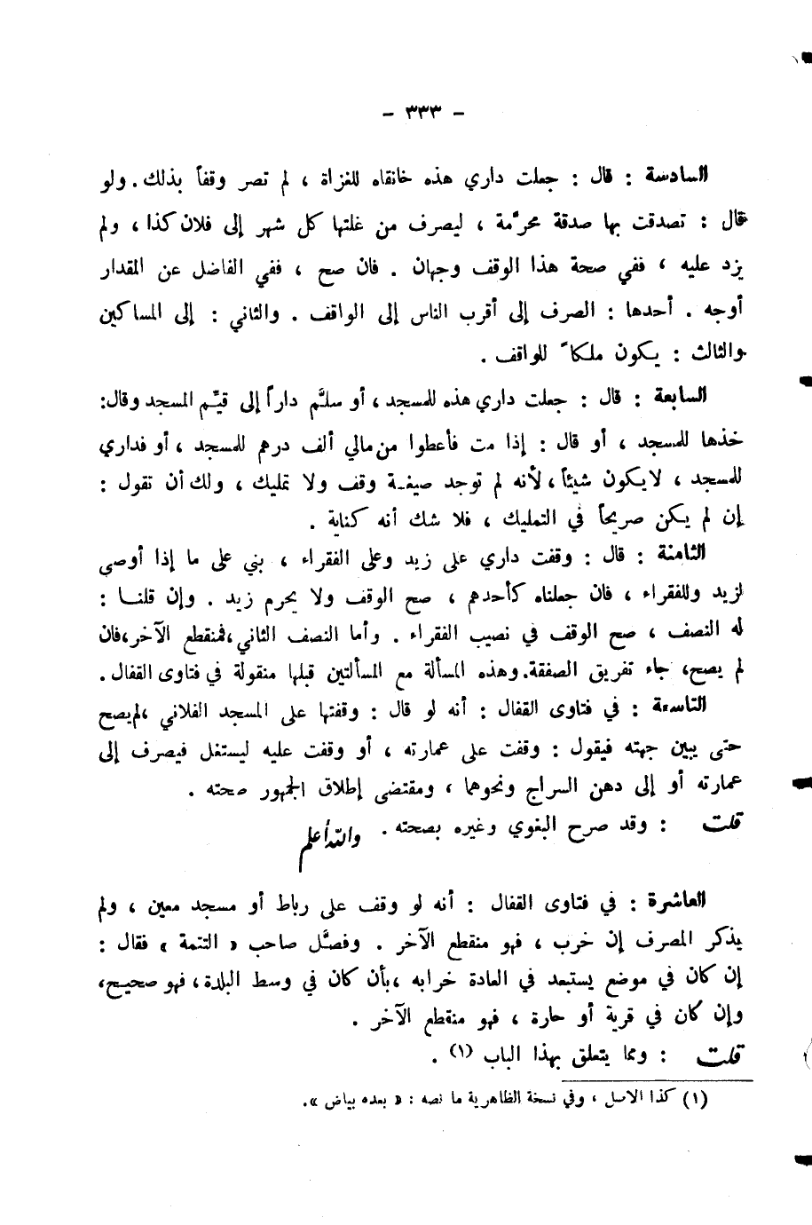 التَّاسِعَةُ: فِي فَتَاوَى الْقَفَّالِ: أَنَّهُ لَوْ قَالَ: وَقَفْتُهَا عَلَى الْمَسْجِدِ الْفُلَانِيِّ، لَمْ يَصِحَّ حَتَّى يُبَيِّنَ جِهَتَهُ، فَيَقُولَ: وَقَفْتُ عَلَى عِمَارَتِهِ، أَوْ وَقَفْتُ عَلَيْهِ لِيُسْتَغَلَّ فَيُصْرَفَ إِلَى عِمَارَتِهِ، أَوْ إِلَى دُهْنِ السِّرَاجِ، وَنَحْوِهِمَا، وَمُقْتَضَى إِطْلَاقِ الْجُمْهُورِ صِحَّتُهُ.