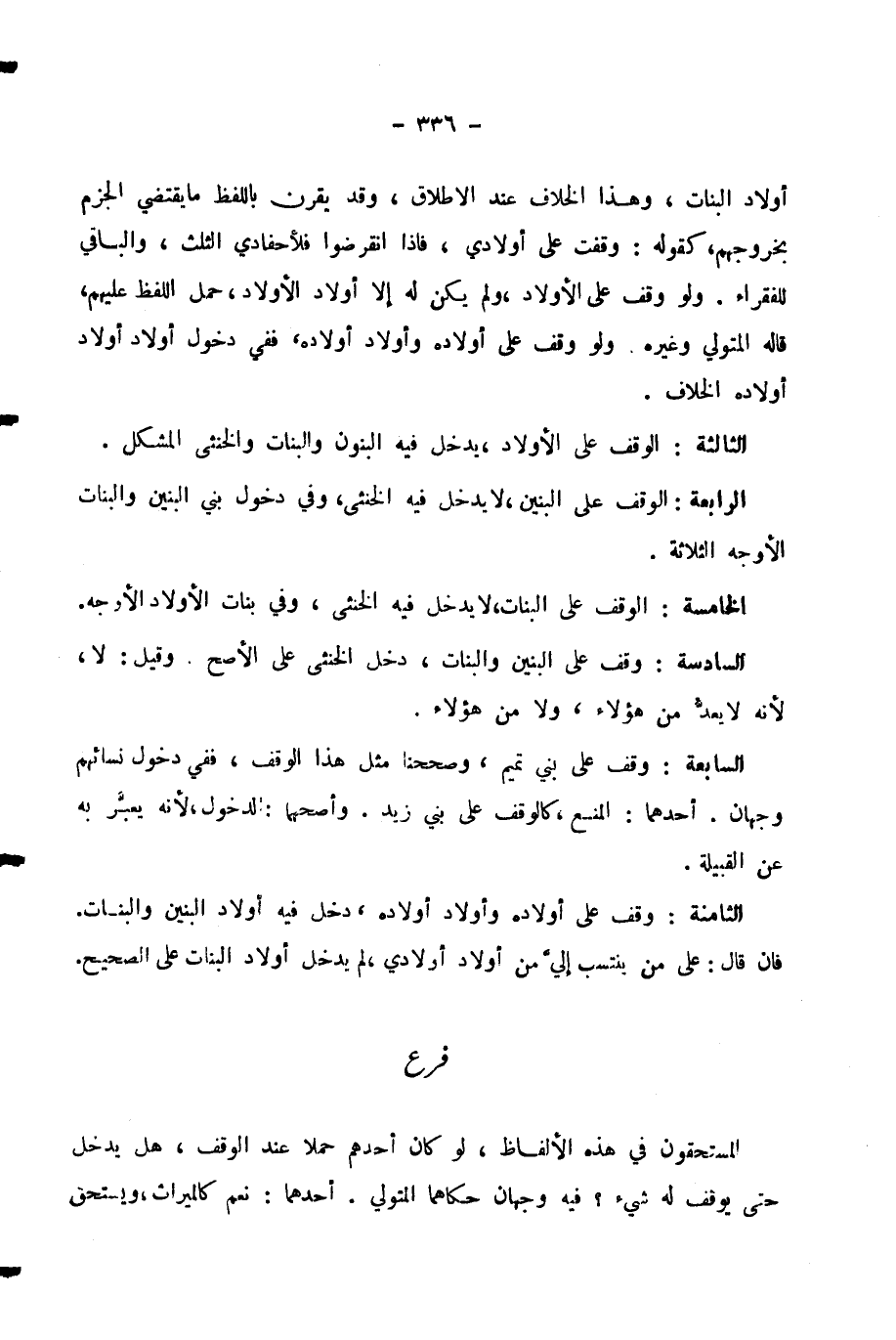 أَوْلَادِ الْبَنَاتِ، وَهَذَا الْخِلَافُ عِنْدَ الْإِطْلَاقِ، وَقَدْ يُقْرَنُ بِاللَّفْظِ مَا يَقْتَضِي الْجَزْمَ بِخُرُوجِهِمْ، كَقَوْلِهِ: وَقَفْتُ عَلَى أَوْلَادِي، فَإِذَا انْقَرَضُوا فَلِأَحْفَادِي الثُّلُثُ، وَالْبَاقِي لِلْفُقَرَاءِ، وَلَوْ وَقَفَ عَلَى الْأَوْلَادِ، وَلَمْ يَكُنْ لَهُ إِلَّا أَوْلَادُ الْأَوْلَادِ، حُمِلَ اللَّفْظُ عَلَيْهِمْ، قَالَهُ الْمُتَوَلِّي، وَغَيْرُهُ، وَلَوْ وَقَفَ عَلَى أَوْلَادِهِ وَأَوْلَادِ أَوْلَادِهِ، فَفِي دُخُولِ أَوْلَادِ أَوْلَادِ أَوْلَادِهِ الْخِلَافُ، الثَّالِثَةُ: الْوَقْفُ عَلَى الْأَوْلَادِ، يَدْخُلُ فِيهِ الْبَنُونَ، وَالْبَنَاتُ، وَالْخُنْثَى الْمُشْكِلُ. الرَّابِعَةُ: الْوَقْفُ عَلَى الْبَنِينَ، لَا يَدْخُلُ فِيهِ الْخُنْثَى، وَفِي دُخُولِ بَنِي الْبَنِينَ، وَالْبَنَاتِ الْأَوْجُهُ الثَّلَاثَةُ. الْخَامِسَةُ: الْوَقْفُ عَلَى الْبَنَاتِ، لَا يَدْخُلُ فِيهِ الْخُنْثَى، وَفِي بَنَاتِ الْأَوْلَادِ الْأَوْجُهُ. السَّادِسَةُ: وَقَفَ عَلَى الْبَنِينَ وَالْبَنَاتِ، دَخَلَ الْخُنْثَى عَلَى الْأَصَحِّ، وَقِيلَ: لَا لِأَنَّهُ لَا يُعَدُّ مِنْ هَؤُلَاءِ، وَلَا مِنْ هَؤُلَاءِ. السَّابِعَةُ: وَقَفَ عَلَى بَنِي تَمِيمٍ، وَصَحَّحْنَا مِثْلَ هَذَا الْوَقْفِ، فَفِي دُخُولِ نِسَائِهِمْ وَجْهَانِ: أَحَدُهُمَا: الْمَنْعُ، كَالْوَقْفِ عَلَى بَنِي زَيْدٍ، وَأَصَحُّهُمَا: الدُّخُولُ لِأَنَّهُ يُعَبَّرُ بِهِ عَنِ الْقَبِيلَةِ. الثَّامِنَةُ: وَقَفَ عَلَى أَوْلَادِهِ، وَأَوْلَادِ أَوْلَادِهِ، دَخَلَ فِيهِ أَوْلَادُ الْبَنِينَ، وَالْبَنَاتِ، فَإِنْ قَالَ: عَلَى مَنْ يَنْتَسِبُ إِلَيَّ مِنْ أَوْلَادِ أَوْلَادِي، لَمْ يَدْخُلْ أَوْلَادُ الْبَنَاتِ عَلَى الصَّحِيحِ.