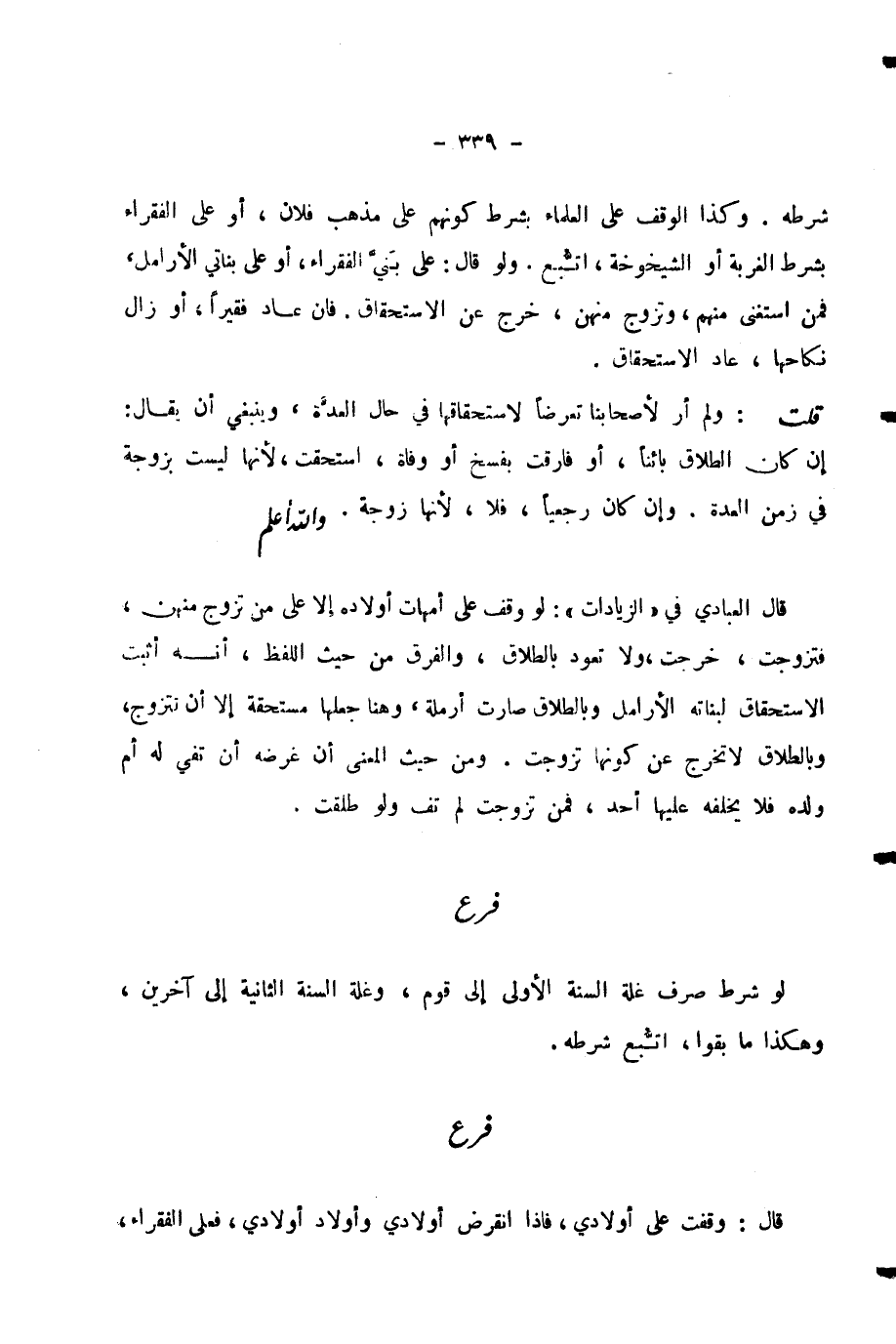 قَالَ الْعَبَّادِيُّ فِي «الزِّيَادَاتِ» : لَوْ وَقَفَ عَلَى أُمَّهَاتِ أَوْلَادِهِ إِلَّا عَلَى مَنْ تَزَوَّجَ مِنْهُنَّ، فَتَزَوَّجَتْ خَرَجَتْ، وَلَا تَعُودُ بِالطَّلَاقِ، وَالْفَرْقُ مِنْ حَيْثُ اللَّفْظُ أَنَّهُ أَثْبَتَ الِاسْتِحْقَاقَ لِبَنَاتِهِ الْأَرَامِلِ، وَبِالطَّلَاقِ صَارَتْ أَرْمَلَةً، وَهُنَا جَعَلَهَا مُسْتَحِقَّةً إِلَّا أَنْ تَتَزَوَّجَ، وَبِالطَّلَاقِ لَا تَخْرُجُ عَنْ كَوْنِهَا تَزَوَّجَتْ. وَمِنْ حَيْثُ الْمَعْنَى أَنَّ غَرَضَهُ أَنْ تَفِيَ لَهُ أُمُّ وَلَدِهِ فَلَا يَخْلُفُهُ عَلَيْهَا أَحَدٌ، فَمَنْ تَزَوَّجَتْ لَمْ تَفِ وَلَوْ طُلِّقَتْ.