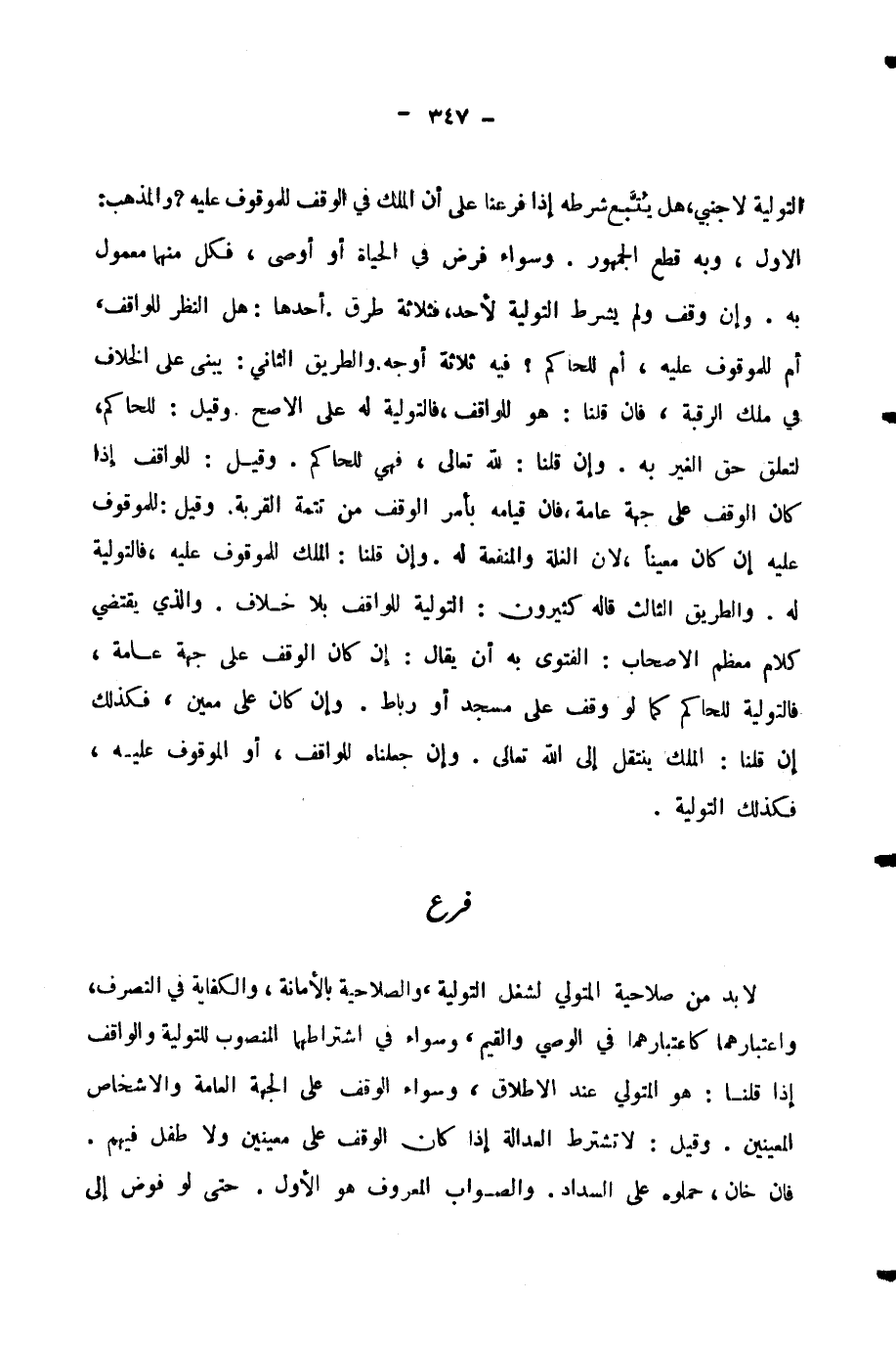 لَا بُدَّ مِنْ صَلَاحِيَةِ الْمُتَوَلِّي لِشَغْلِ التَّوْلِيَةِ، وَالصَّلَاحِيَةِ بِالْأَمَانَةِ، وَالْكِفَايَةِ فِي التَّصَرُّفِ، وَاعْتِبَارُهُمَا كَاعْتِبَارِهِمَا فِي الْوَصِيِّ، وَالْقَيِّمِ، وَسَوَاءٌ فِي اشْتِرَاطِهِمَا الْمَنْصُوبُ لِلتَّوْلِيَةِ وَالْوَاقِفُ إِذَا قُلْنَا: هُوَ الْمُتَوَلِّي عِنْدَ الْإِطْلَاقِ، وَسَوَاءٌ الْوَقْفُ عَلَى الْجِهَةِ الْعَامَّةِ، وَالْأَشْخَاصِ الْمُعَيَّنِينَ. وَقِيلَ: لَا تُشْتَرَطُ الْعَدَالَةُ إِذَا كَانَ الْوَقْفُ عَلَى مُعَيَّنِينَ، وَلَا طِفْلَ فِيهِمْ، فَإِنْ خَانَ حَمَلُوهُ عَلَى السَّدَادِ، وَالصَّوَابُ الْمَعْرُوفُ هُوَ الْأَوَّلُ. حَتَّى لَوْ فَوَّضَ إِلَى